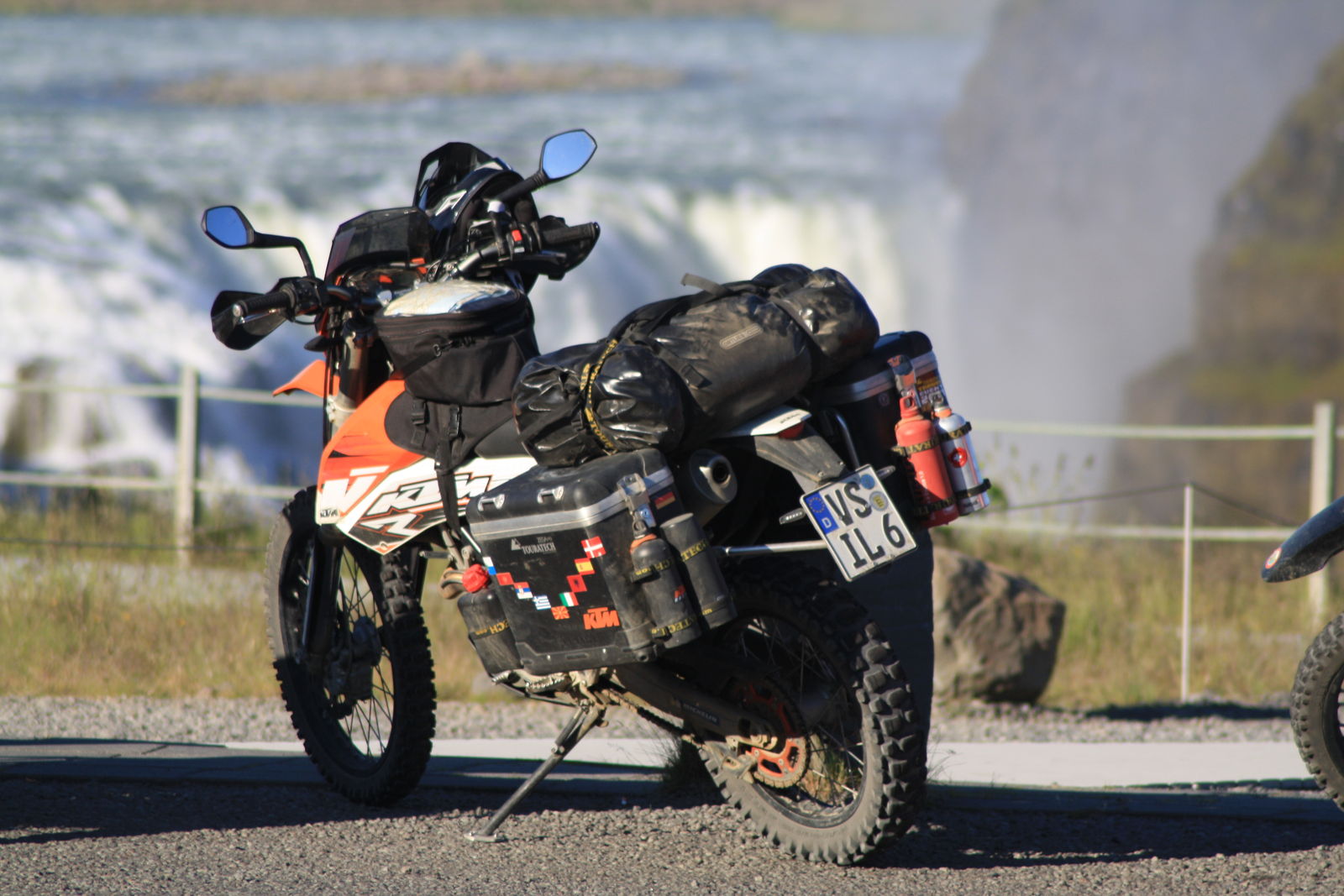 Für die Islandreise hatte ich mich allerdings für normale 5 Liter Kanister entschieden, die ich mit dem Touratech Winkelblech einfach an die Koffer gemacht habe. Da wir eh fast alles im Stehen gefahren sind, tut‘s auch das Originale Windschild von KTM für knapp 50€