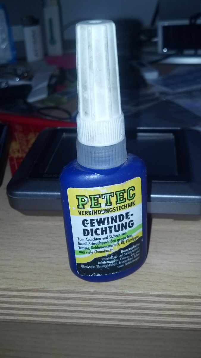 Provisorisch: fett das Gewinde mit blauen Kleber einstreichen.....natürlich nicht sofort weiter fahren, erstmal warten bis der Kleber getrocknet ist. Dann zur nächsten guten Werkstatt Sad !