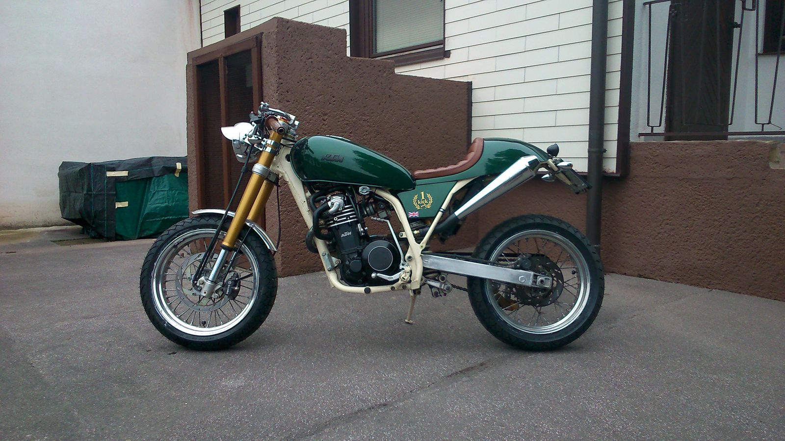 die Proportionen sind bissl "komisch" weil Komponenten (Tank Bürzel usw.) haben normale Abmessungen, jedoch is das ganze Moped viiieeel kleiner als eine Thruxton oder Guzzi Le Mans.
