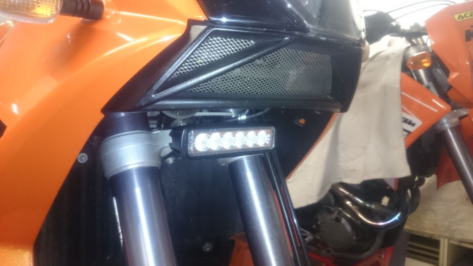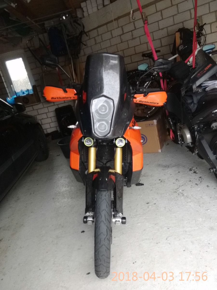 Hatte heute langweilig und habe ein LED Teil ähnlich dem von Atze wo mal übrig geblieben ist (neu und ungebraucht, 18W, 1400 Lumen - Wer's glaubt wir selig Mr. Green ) an die 950er angebaut und zwar so das es mitlenkt quasi als Kurvenlicht und damit ich bei Tag besser gesehen werde.