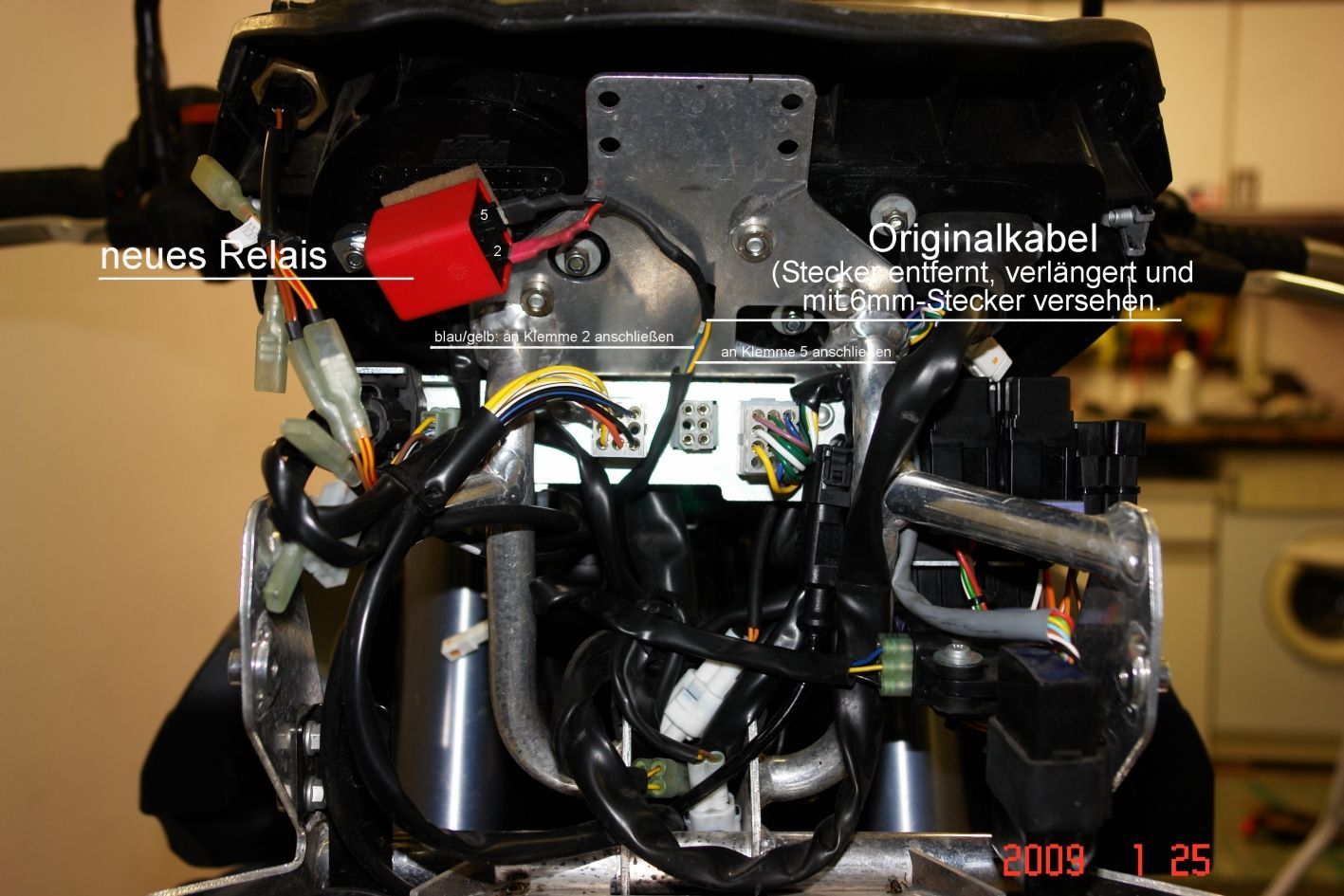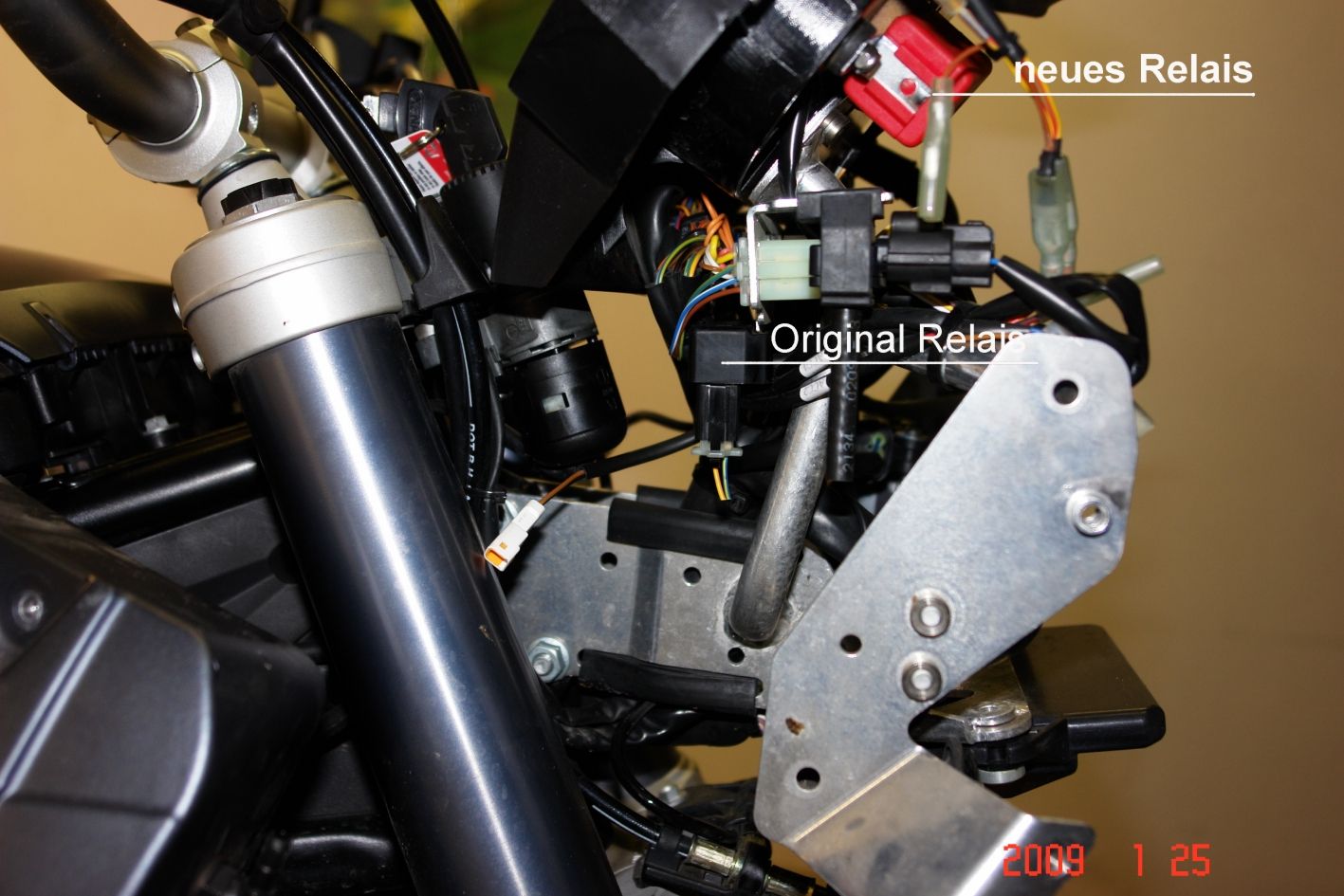 Am Foto von „adv990efi“ ist zwar das neue Relais mit den 2-poligen Kabel und neuen Steckern zu sehen, aber sind dieses Kabel (orange und blau/gelb) die Verlängerten oder die Originalen?