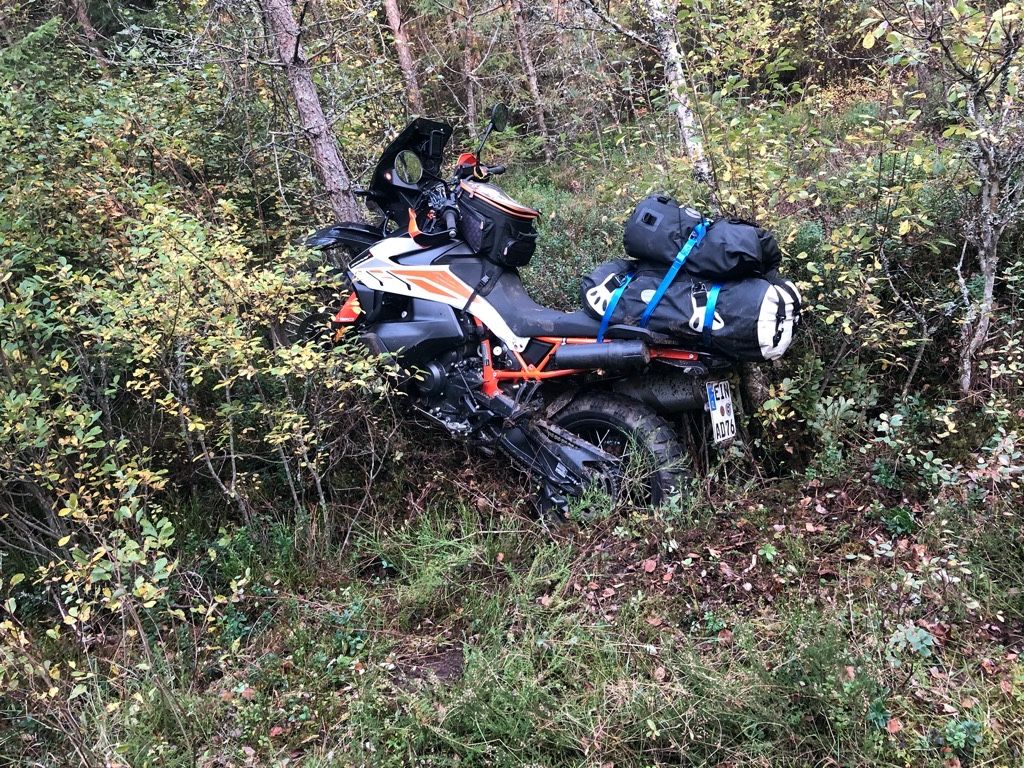 Als ich sie gefunden habe, ist sie schon drunter vorgekrabbelt und das Mototrrad lag komplett im Graben, erst dann das Vorderrad nach oben, da ist das Bild dann enstanden.