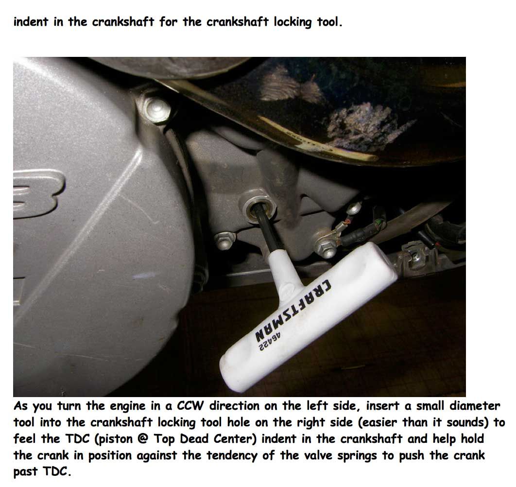 Zum Einstellen selber, empfehle ich die KTM Spezialschraube o.ä., da nur durch die Spitze und die definierte Länge (bei OT geht die Schraube bündig ins Gehäuse) das sichere Auffinden des OT gewährleistet ist. Allzu schnell hat man die Nockenwellen raus und die Kurbelwelle dreht weiter, oder man hat sich die Einbauposition nicht exakt markiert.