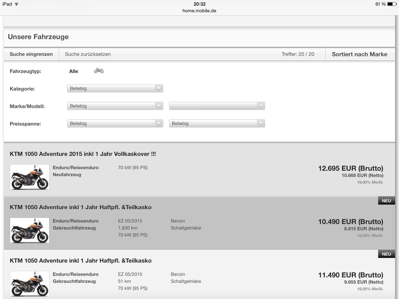 Habe die Tage die 1050 gesehen und bin drauf gesessen. Das alleine hat schon gereicht dry . Fürs Gelände gibt es wesentlich geeigneteres Material für weniger Geld, für Touren ist sie bestimmt keine schlechte Wahl.