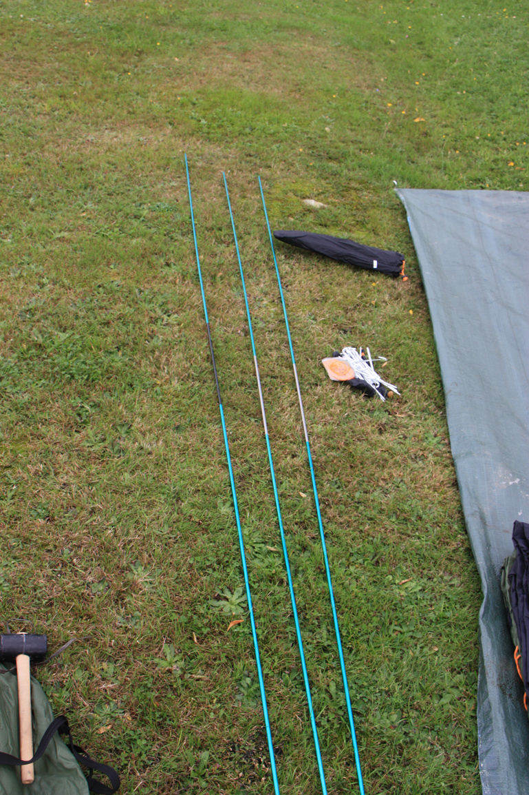 - Der Aufbau ist recht easy, Zelt ausbreiten, die drei Stangen rein (durchschiebe- und Einklippstechnik), Abspannen, Innenzelt einsetzen (wenn nicht schon vorher) (Aufbau alleine ist auch Möglich)