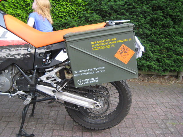 Hier mal Fotos von den auf jeden Fall günstigsten Boxen! Dank @ der Enno!! Kosten 16 Euro pro Box, sind aber auch rund 3 KG schwerer als eine Alubox, beide zusammen 16.5 Kg. Kann ich mit Leben bei dem Preis. Es sollte jedoch ein Verstärkungsblech von innen eingesetzt werden. Muß ich noch machen, da die Boxern sonst etwas rumwabbeln.