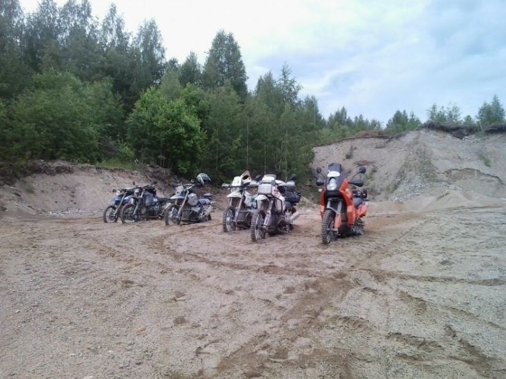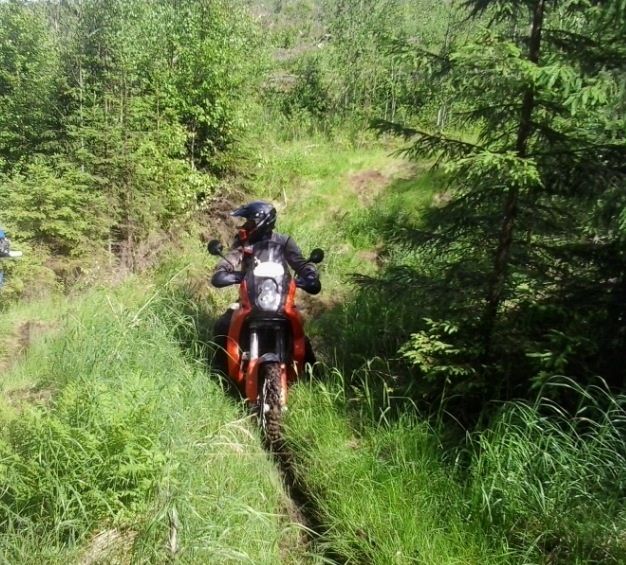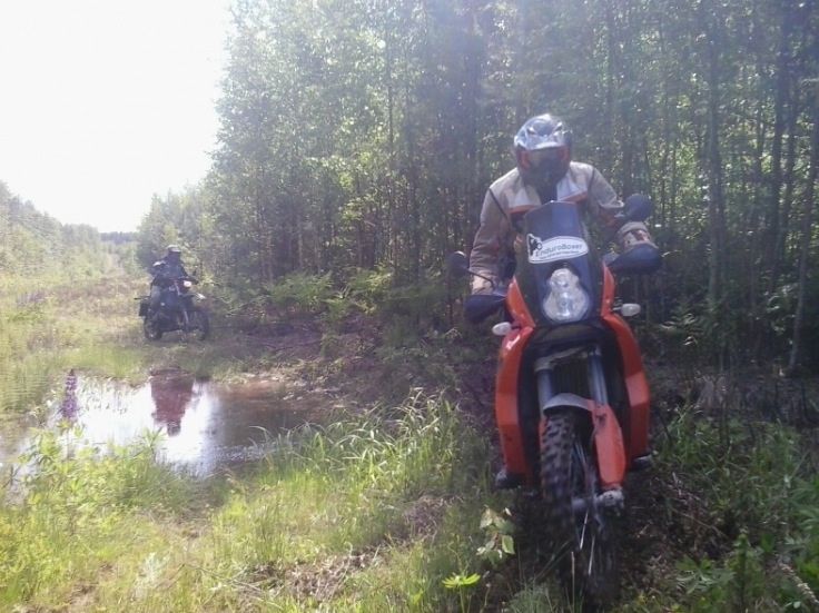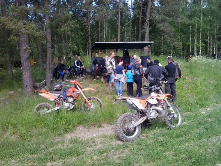 Es ist Sonntag, der zweite Fahrtag der Tour. Wir haben noch etwas mit dem ersten Tag zu kämpfen. Die zwei Tourguides kontaktierten noch einen „alten“ Bekannten, der mit uns auf die Reise geht. Es wurde wieder in zwei Gruppen gefahren. Nach viel Piste und etwas Trial durch die tollen finnischen Wälder, stets an der Grenze zum Nachbarland Russland entlang machten wir eine Pause an einer Tankstelle. Hier kam nochmal ein einheimischer Guide dazu. Er war auch auf einer KTM unterwegs. So langsam, dachten wir, wird das ORA NGE hier zur Überzahl. Jetzt wurden die Strecken noch etwas verwinkelter und wir bewegten uns teilweise auf der Grenze zu Russland. Nach etwa einer halben Stunde trafen wir auf zwei Wettbewerbsendurofahrer. Diese führten uns zu ihrer „Hausstrecke“. Hier war alles was ein Enduroherz begehrt. Steile Auf- und Abfahrten, Trials, Waschbretter, Steinfelder, Schlammbäder und vieles mehr. Wir durften mit unseren Maschinen eine abgeschwächte Version ihrer Strecke fahren. Später dann konnte wir ins Eingemachte. Die Strecke war einfach nur spitze. Ich kam voll ins Schwitzen und meine geliehene KTM EXC 200 2-Takt bestimmt auch. Nach ein paar gegrillten Würstchen und etwas Ruhepause bewegte sich unser Trott, unter der Führung einer BMW F 800 GS, auf das Tagesziel zu. Die Piste war so schön, dass wir die Zeit für einige Bilder nutzten. Simo drehte auch ein paar Clip´s, die wir später mal veröffentlichen wollen.