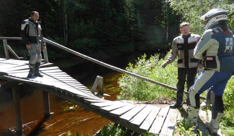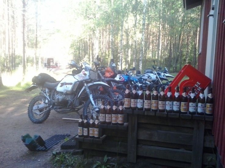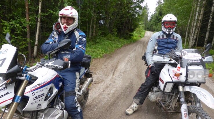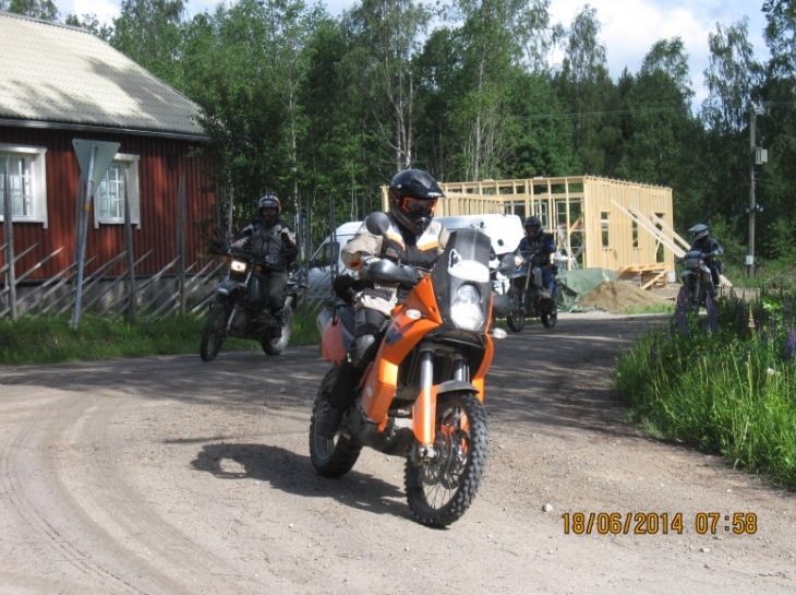 Dieser Tag empfing uns in Form eines ausgiebigen Wolkenbruchs. Doch wir hatten Glück: der Wolkenbruch ging in einen 24h-Dauerregen über. Bei knackigen 3 Grad durften wir unsere Enduroklamotten aus der 90 Grad Sauna holen. Leider speicherten die Kleidung die Wärme nicht lange. Die Witterungsbedingungen zwangen uns dazu uns in 2 Gruppen aufzuteilen. Eine HP2 Prenium (Slowmotion) und eine R 100 GS und LC 8 Hardcore Gruppe zu machen. Ich kann nur von der einen Gruppe erzählen. Bei uns ging es teilweise recht knackig zu, die Navigation war auch ganz schön anspruchsvoll. Der heutige Tag endet mit dem Besuch bei dem Besitzer mit der einzigen in Finnland zugelassenen BMW HP2. Alle BMW Fahrer wurden herzlich empfangen und bekamen eine trockene Unterkunft. Den Abend beendeten wir mit einem aufwärmenden Saunagang und dem Grillen mehrerer Fische. Wir bewiesen Herz und ließen auch Wolfgang unseren KTM Fahrer in dieser Herberge schlafen.. Unter Bikern lässt man sich gegenseitig nicht im Stich.