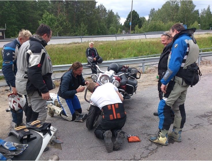 Wieder auf der Straße durften wir beim nächsten Tankstopp einem Harley Kollegen helfen. Ihm war der Lenker vibrationsbedingt gebrochen. Fachkundig wurde die Milwaueetechnik in Finnland von deutscher Hand zerlegt, eine internationale Aktion sozusagen. Das Schweißen überließen wir dann dem örtlichen, metallverarbeitenden Handwerk. Inzwischen etwas aus dem Zeitplan geraten machten wir uns wieder neben den Weg und beendeten den Tag in einer idyllischen Holzfällerhütte fernab jeder Zivilisation ohne Strom, fliessend Wasser und natürlich auch ohne Internet. Nicht aber ohne Sauna, eigenem See und einem Festmal mit frischem Lachs aus dem Holzräucherofen.