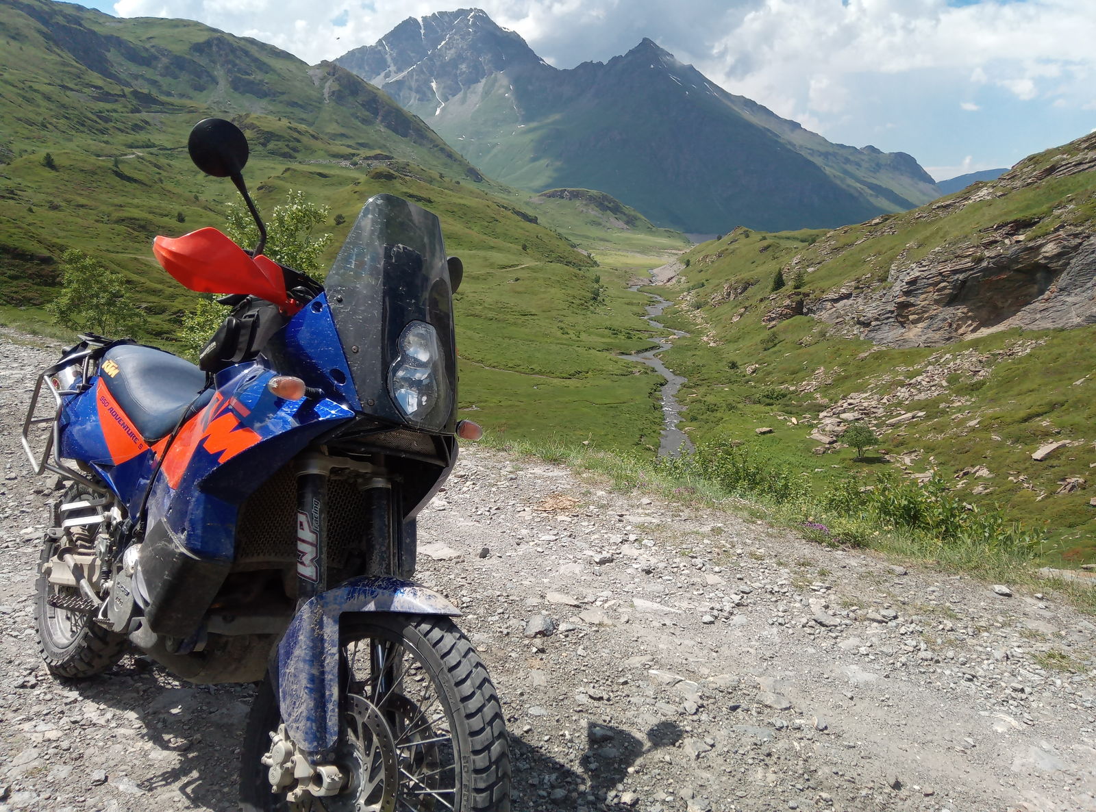 Anfahrt vom Kanton Bern Richtung Wallis am Freitag Nachmittag mit Zwischenübernachtung im wunderschönen Evionnaz (Herberge o.k. und sehr günstig für die Schweiz: 50CHF). Dann am Samstag bei 38°C "Abkürzung über eine Mountainbikepiste in Salvan/Le Cerisier nach Finhaut Richtung MontBlanc. Dann über Chamonix, Cormet de Roselend, Iseran, MontCenis, Susa zum Camping Gran Bosco in Salbertrand. Die Rally-Truppe hatte sich ja schon installiert und im Laufe der Woche trudelten noch mehr LC8ten und sonstiges Gebrumm ein. Wir haben dann gemütlich zu zweit ein paar Touren unternommen (Finestre/Assietta, Sommelier, Lago Nero) sind einmal mit der Truppe ausgeritten (wobei das hat sich nach zehn Minuten erstmal etwas verzögert weil eine 990er streikte), mit denen wir es dann doch noch bis Lac Mont Cenis hinaufgeschafft haben. Ich wie immer ganz hinten Lumpensammler gespielt und ein Franzose hat sich dann auch prompt in ein entgegenkommendes Affentwin-Paar verkeilt. Zum Glück nix schlimmes passiert ausser ein paar verbogenen Teilen, Schrammen und einer schockierten Sozia. Danach ward die Truppe vom Winde verweht und wir fuhren zu viert das nächste Refuge an, um die Plautze zu füllen. Wir sind dann gemütlich weitergfahren (Mont Cenis - echt lässig da oben) und haben den Nachmittag ausklingen lassen. Mein Bedarf an Grossgruppe war dann erstmal wieder gedeckt, woraufhin wir am nächsten Tag eine Tour zum Lago Nero (Hammer!) machten. Irgendwann sind wir dann auch noch das Valle d'Argentere (auch ganz toll) hochgefahren - das kostet zwar 3€, aber das ist es wert. Zwischendrin mal die Gegend erkundet und ein paar Sackgassen gefinden.