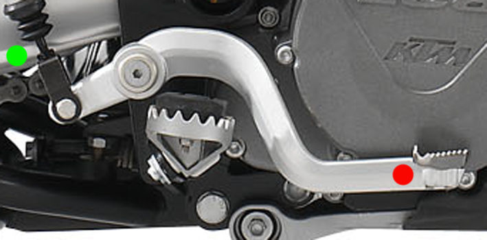 Eine "offizielle" Verstellmöglichkeit ist die über die Druckstange (grün in dem beigefügten Bildausschnitt = original). Die andere "inoffizielle" besteht darin, den Auftritt an der Fußbremse von "obendrauf" nach "untendrunter" zu verlegen (rot im Bild).