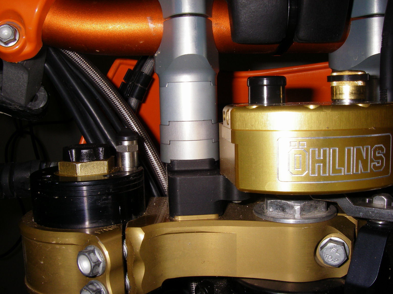 So sieht es bei Martina auf der EXC-Gabelbrücke aus. Das sind auch schon wieder 75mm von Oberkante Brücke bis Unterkante Lenker. Du hast auf der 690 fast die gleiche Gabelbrücke drauf. Da kannst Du mit diesen Teilen (gibts bei Sommer, zweites Loch hab ich selber gebohrt, schwarz gemacht mit Aufkleberfolie) 30mm oder doppelt 60mm Lenkererhöhung schaffen. Passende längere Schrauben mit flachem Kopf und Festigkeit 10,6 gibts im Schraubenhandel für ein paar Cent zu kaufen. Ansonsten mit hohem Kopf kaufen und mit Bohrmaschine und Flex den Kopf flacher schleifen. Und schön mit Schraubenkleber "MITTELFEST" eindrehen! Sieht nicht so stabil aus, hat aber schon einige, mal mehr mal weniger böse Stürze verzugfrei überlebt. Ansonsten verbiegen mal die Schrauben etwas->gehen aber leicht zu richten.