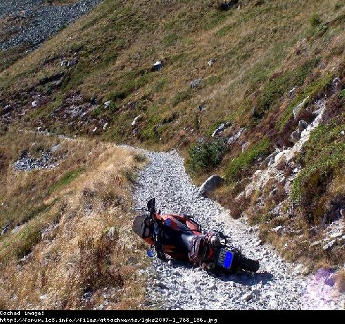 Ich weiß wo das Bild aufgenommen wurde, an dieser Stelle habe ich (mit Sozia) nur ein paar Wochen vor KTM-Bremen die Kontrolle über das Moped (mit Sozia) verloren, hab' die Sache aber gut abgefangen, bin nicht gestürzt. Links, auf dem Bild nicht ersichtlich, geht es einige Meter runter. Die Angelegenheit hat mich etwas Scheiß gekostet.