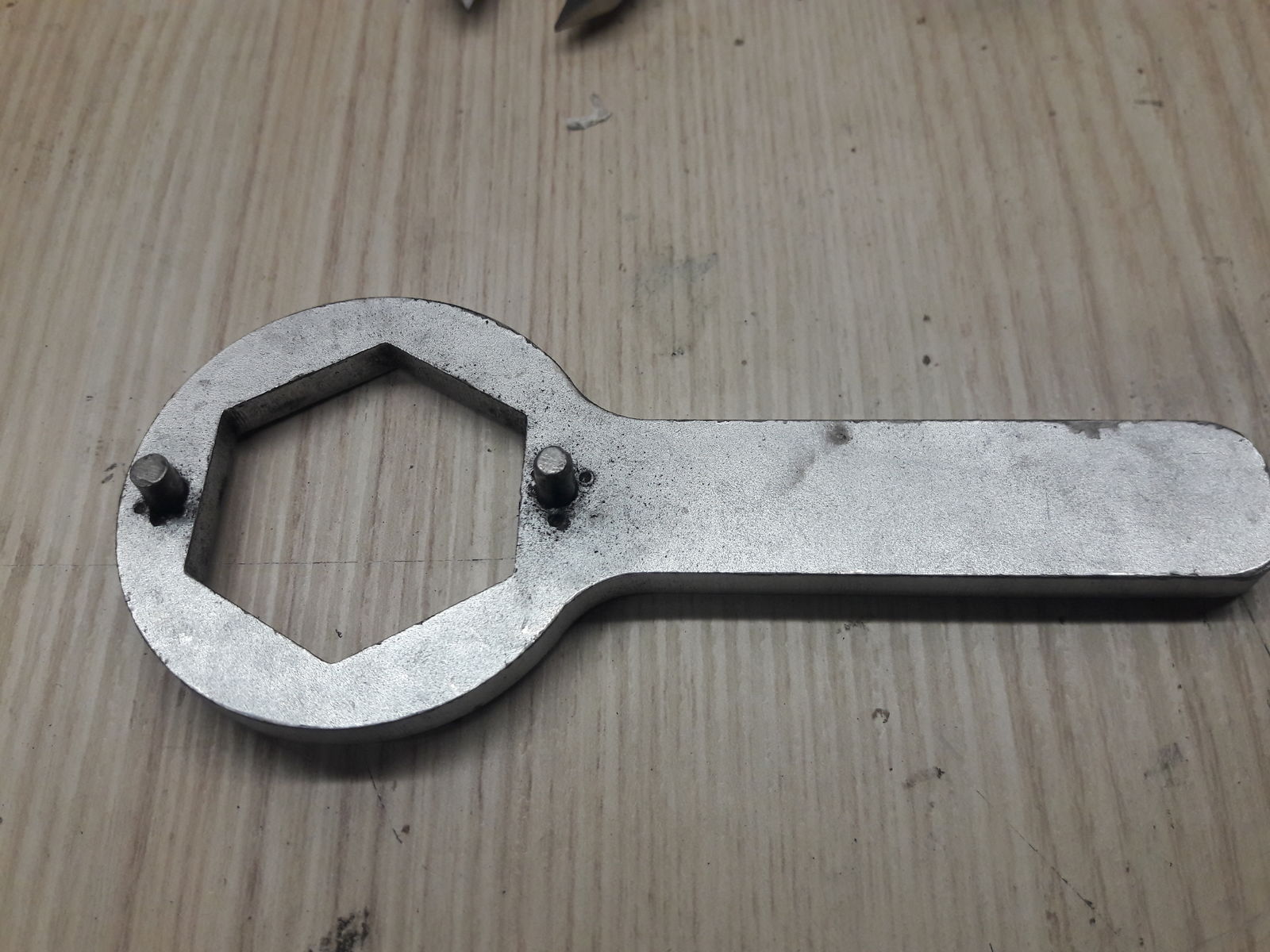 Ebenso habe ich in den 32er Radmutterschlüssel 2 Hartmetallstift (4mm) eingeschweißt und damit kann man dann die Gabel öffnen.