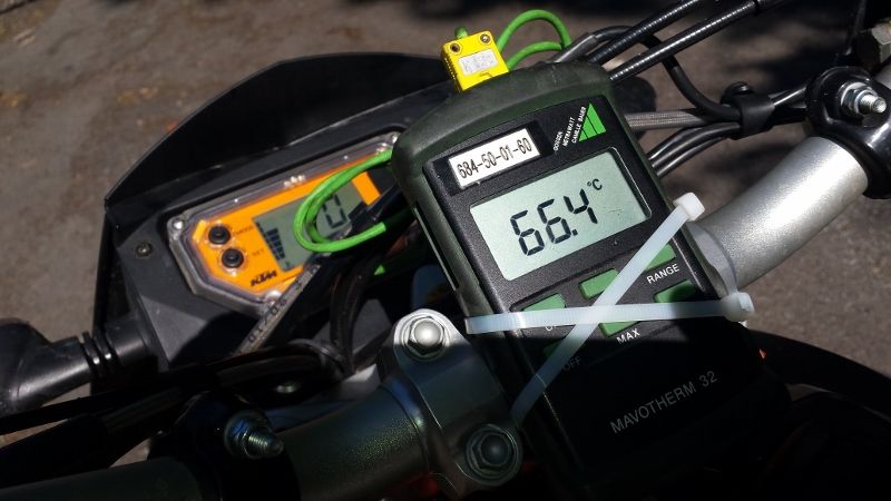 Wenn ich Euch Werte durchgebe und meine genauen Messungen mache habe ich mir ein digitales Thermometer besorgt dass einen Bereich von -50 bis +130 anzeigen kann. Diese wird dann mal schnell am Lenker fixiert und dort angebracht wo ich was messen will ( kommt dann aber wieder ab , will nicht zu viel montiert haben )