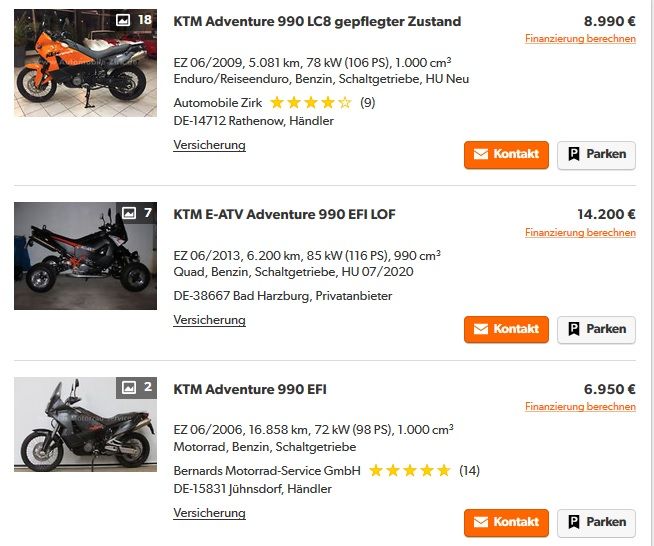 Der Freundschaftspreis für Deine 990er ist sehr sympathisch, freut mich für Dich! Wobei ich denke, man darf hier nicht die Wunschpreise aus Mobile und Co. als Maßstab anlegen. Ich kenne zwar nicht die realistischen Gebrauchtpreise in F oder auch in Ö, aber eine Inzahlungnahme einer 10-jährigen Adventure mit 80tsd auf dem Buckel dürfte sich auch knapp unterhalb 3000 Euro ansiedeln. Andersherum gefragt: bietet mir wer 4500 Euro für meine sehr gepflegte 950S aus 2003 mit 87tsd? Ich könnte schwach werden! OK, vielleicht nur...! Wink