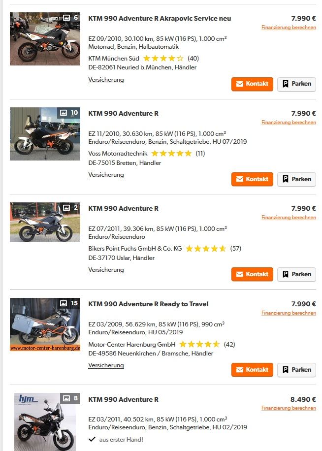 Entweder man handelt mit dem Verkäufer einen für beide Seiten akzeptablen Preis aus oder die Gebrauchtpreise werden durch diese, im Internet veröffentlichten, Verkaufsanzeigen immer höher. Weil natürlich orientiert sich jeder, der eine Verkaufsabsicht hat, sich an den Preisen auf den verschiedenen Plattformen. Um welchen Betrag dann so ein Motorrad tatsächlich den Besitzer wechselt steht dann ja leider nirgendwo .... wäre aber sowohl für den potentiellen Verkäufer als auch Käufer eine wertvolle Information. Zur Zeit werden da halt eher die Verkäufer begünstigt ...
