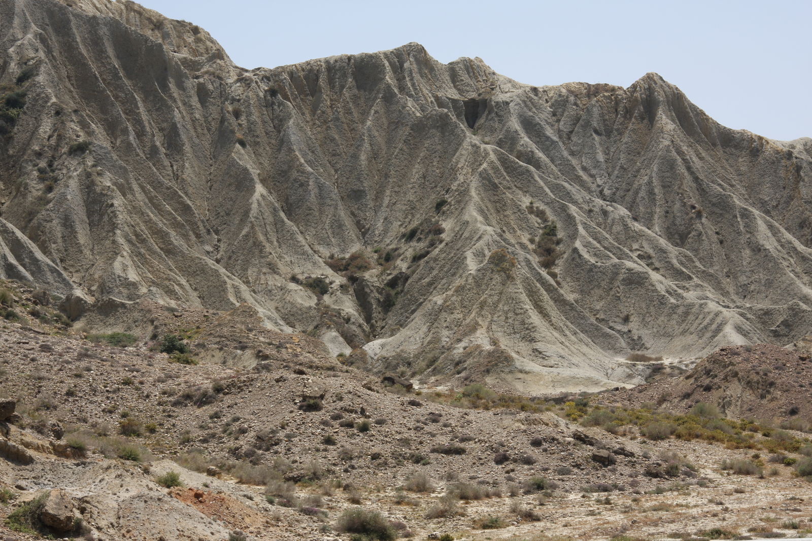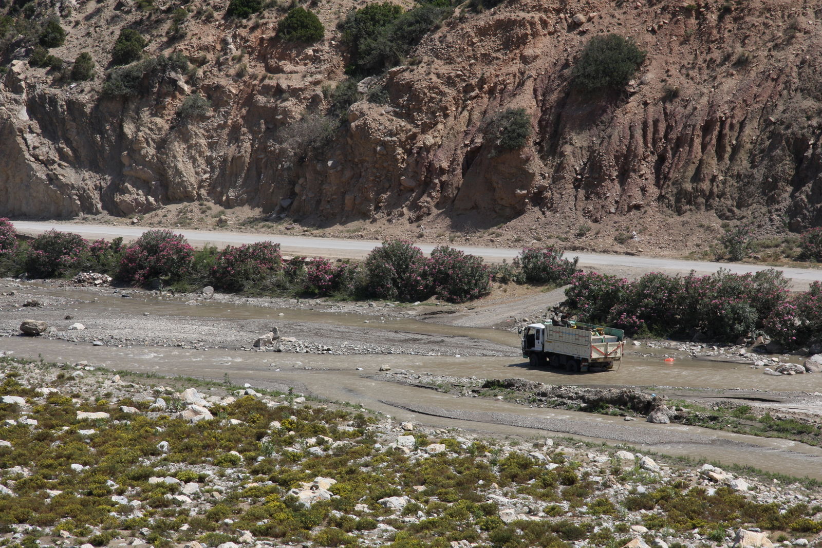 | Fruchtbares Tal, trockene Höhen und unten eine kleine Straße, mal mit, mal ohne Asphalt. |