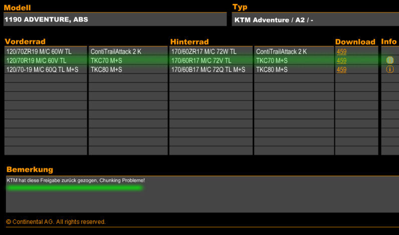 Hat irgendjemand mittlerweile Erfahrungen mit einem TKC 70 - Satz (hinten + vorne) auf der ADV 1190 R - egal ob nun freigegeben oder nicht; geben sollte es ihn ja den 90/90-21 angeblich Wink Question