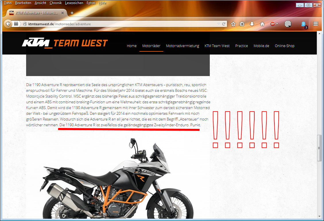 Mir gings um die Aussage das KTM deshalb im Ernstfall den Motor nicht austauschen würde, weil kein Off-Asphalt-Use in der Werbe-Seite angesagt ist......bei der "R" ist das aber wohl, wie oben gesehen.
