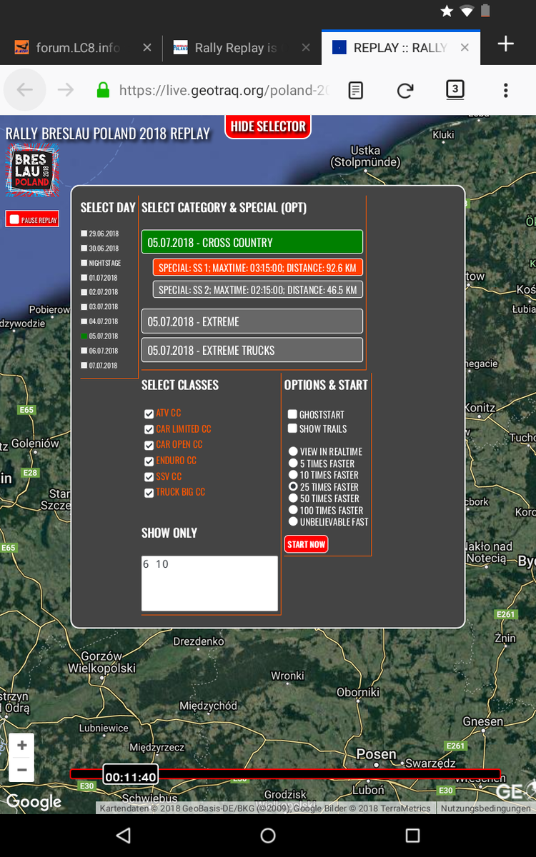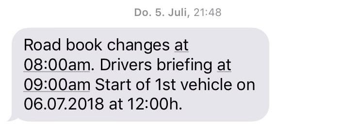 Ab 8:00 Uhr neues Roadbook, ab 9 Fahrerbesprechung, ab 12 Start.