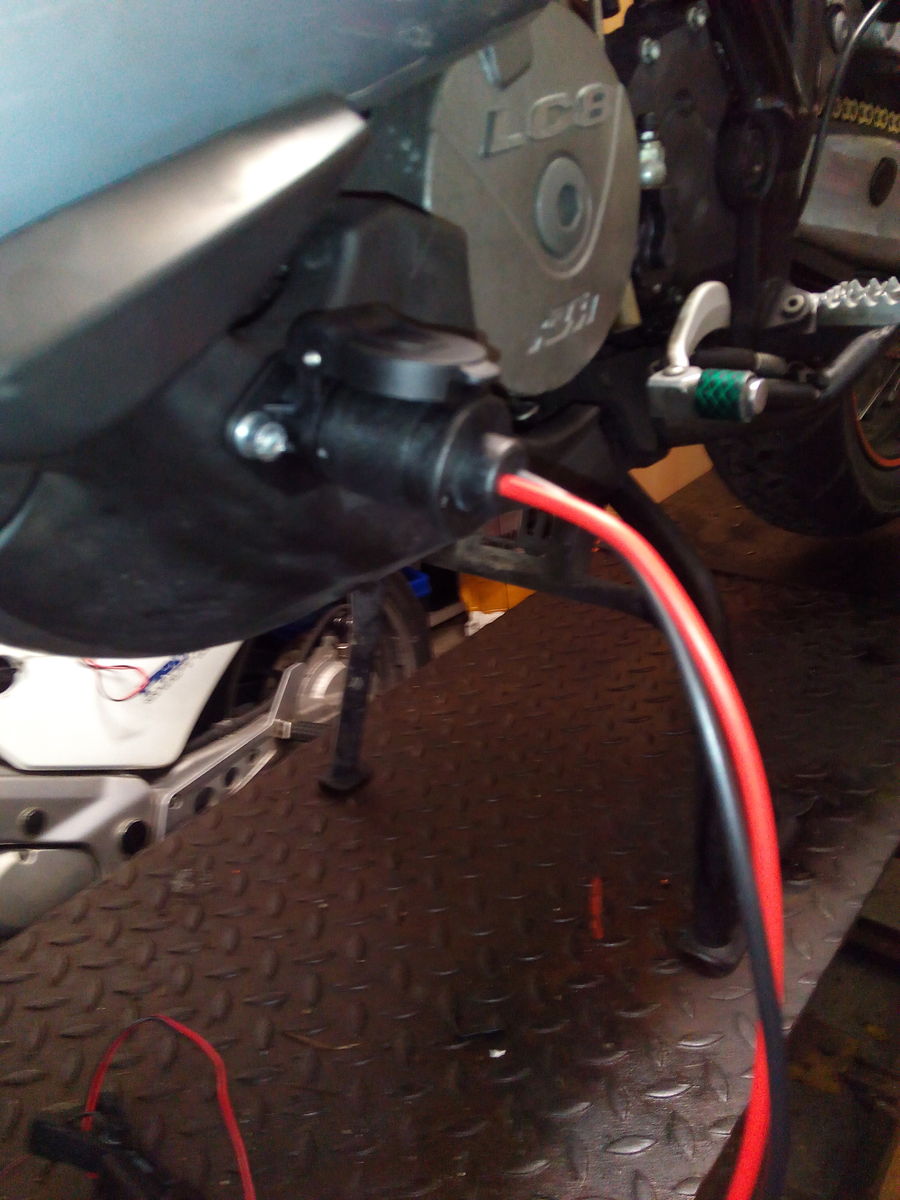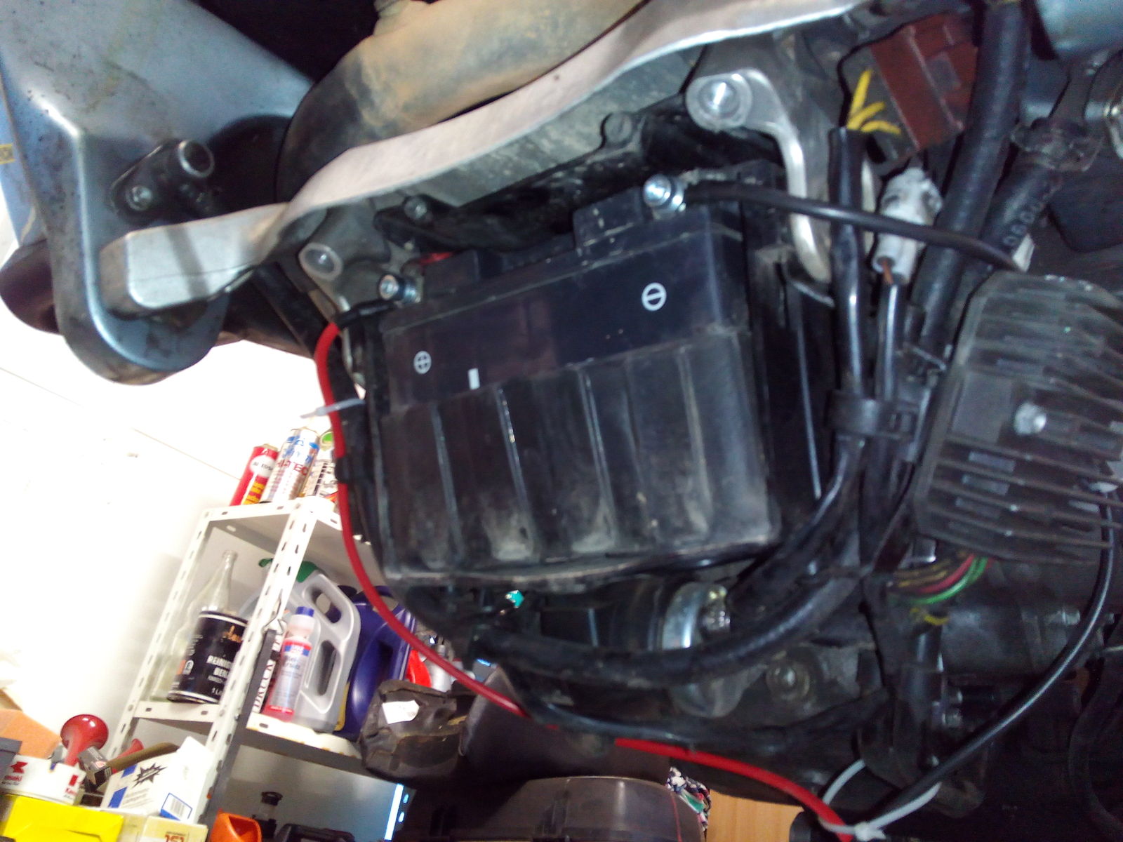 Eingebaut ist das fix. 26mm Loch in den Plastikteil des Motorschutzes bohren, die 2 Anschlüsse unten locker verlegen (Kabelbinder) und ran an die Batterie. Btw hab ich die Schrauben an der Batterie gleich mal gegen 6er Inbus getauscht. Dieses Gewürge mit der Nuß oder Kreuzschlitz hat damit ein Ende.