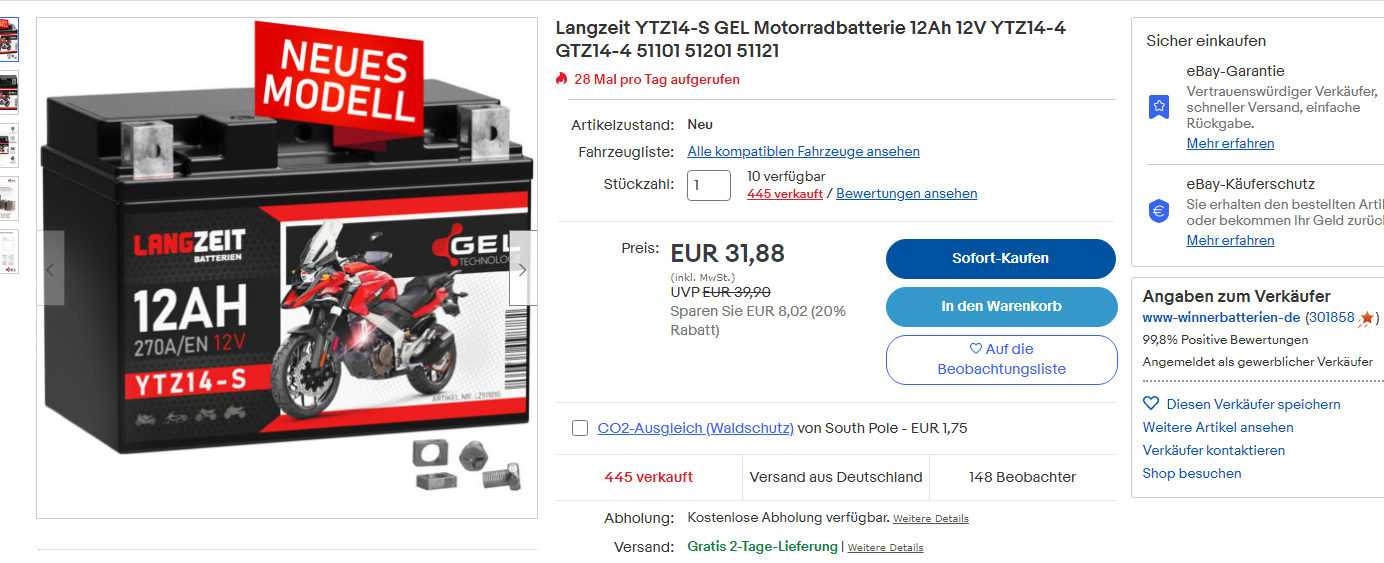 nachdem meine 990S nun eine neue Batterie braucht, will ich Euch meine Quelle für die originale YUASA YTZ-14S nicht vorenthalten: