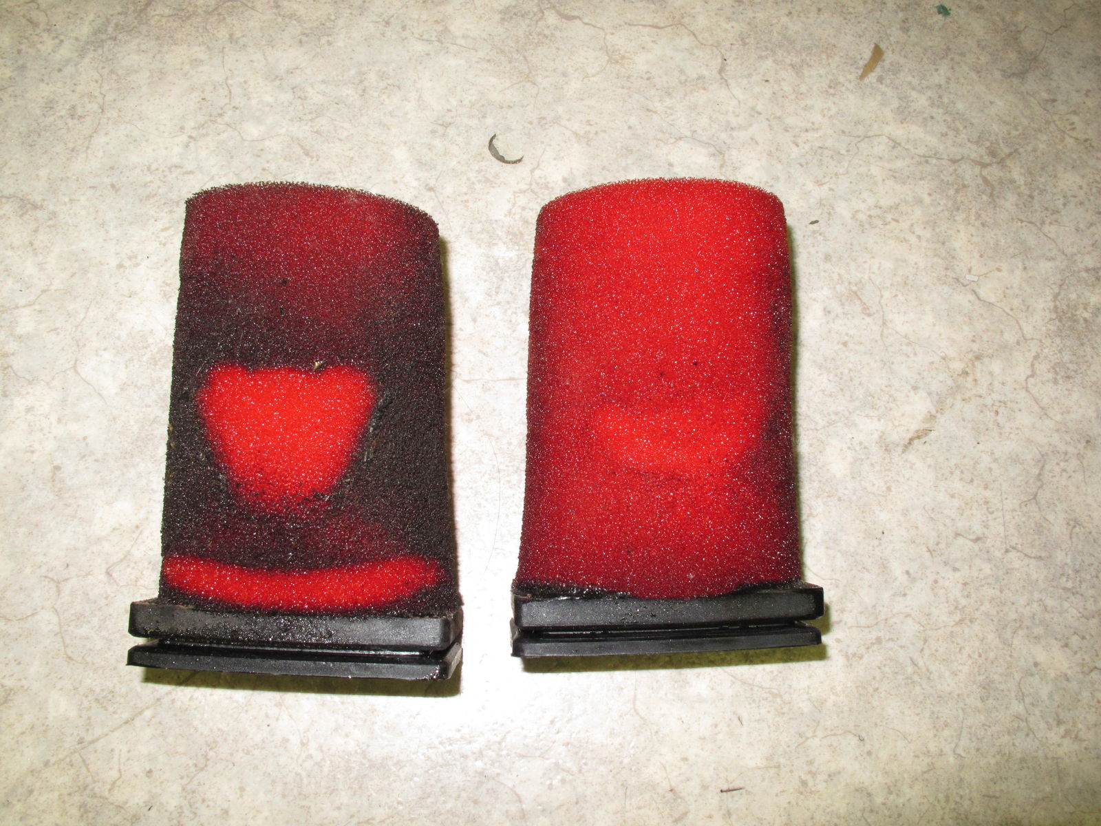 Auf dem Foto sind zwei Filter nach jeweils 500km Sandwegen und etwas offroad zu sehen. Sehr zügig gefahren! Rechts der vom Mopped der schokotrine, links der von meiner Karre. Wie man an der Verteilung des Drecks sieht, bin ich fast die gesamte Strecke hinterher gefahren Mr. Green .