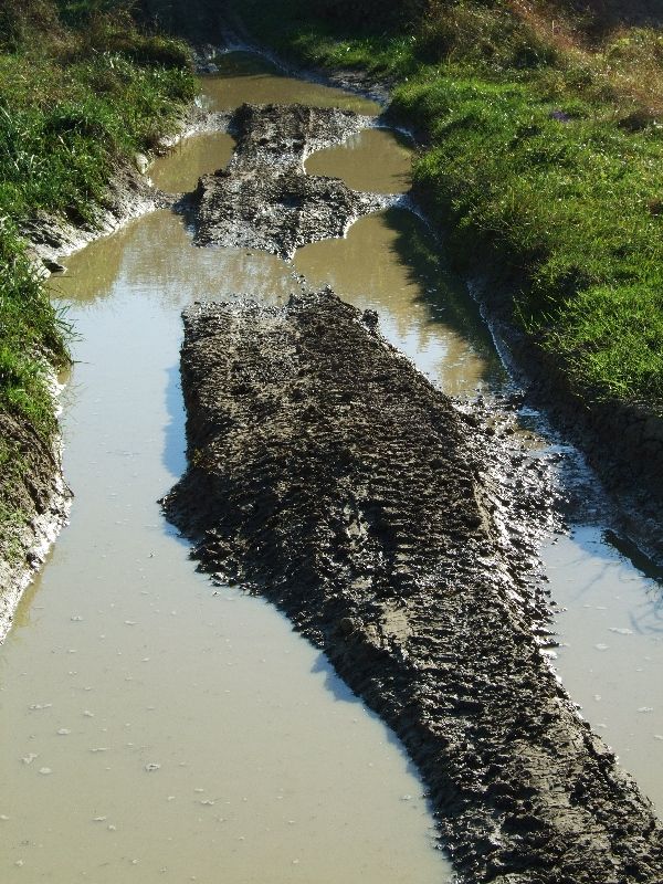 Auffahrten mit tiefen Spurrillen und Schlamm im Anlaufbereich