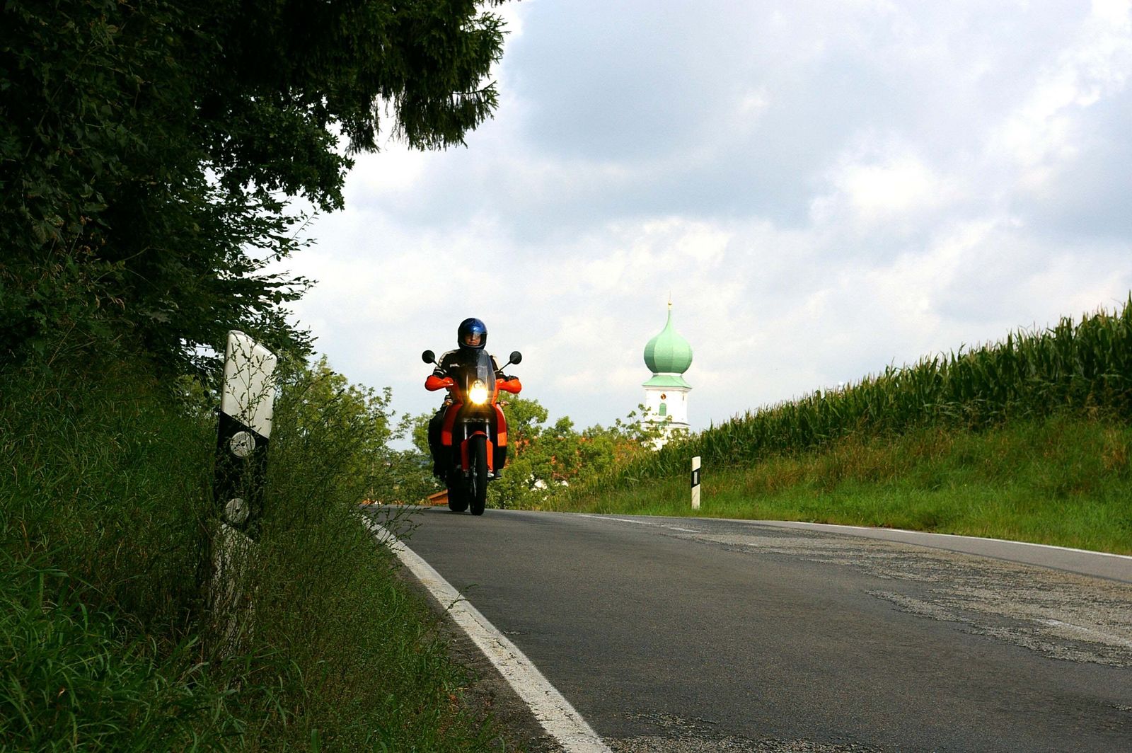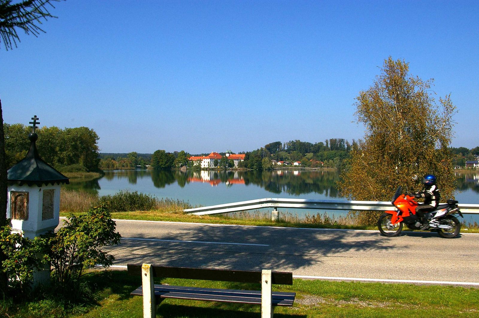 Kaum 30 Kilometer sind seit München vergangen und schon ist man so richtig auf dem Land. Es geht durch kleine Ortschaften über sanfte Hügel und im Zickzack durch Wälder. Hier ist fast kein Verkehr mehr, hie und da mal ein paar Autos von Einheimischen die gerade vom Kirchgang kommen, das war´s. Dabei sollte man aber nicht leichtsinnig werden, denn auch Sonntags kann schon mal unverhofft nach einer Kurve ein Traktor oder Mähdrescher vor einem auftauchen. Bei manchem Autofahrer ist außerdem nicht so ganz klar ob er nun aus der Kirche kommt oder aus dem danebenliegenden Wirtshaus.