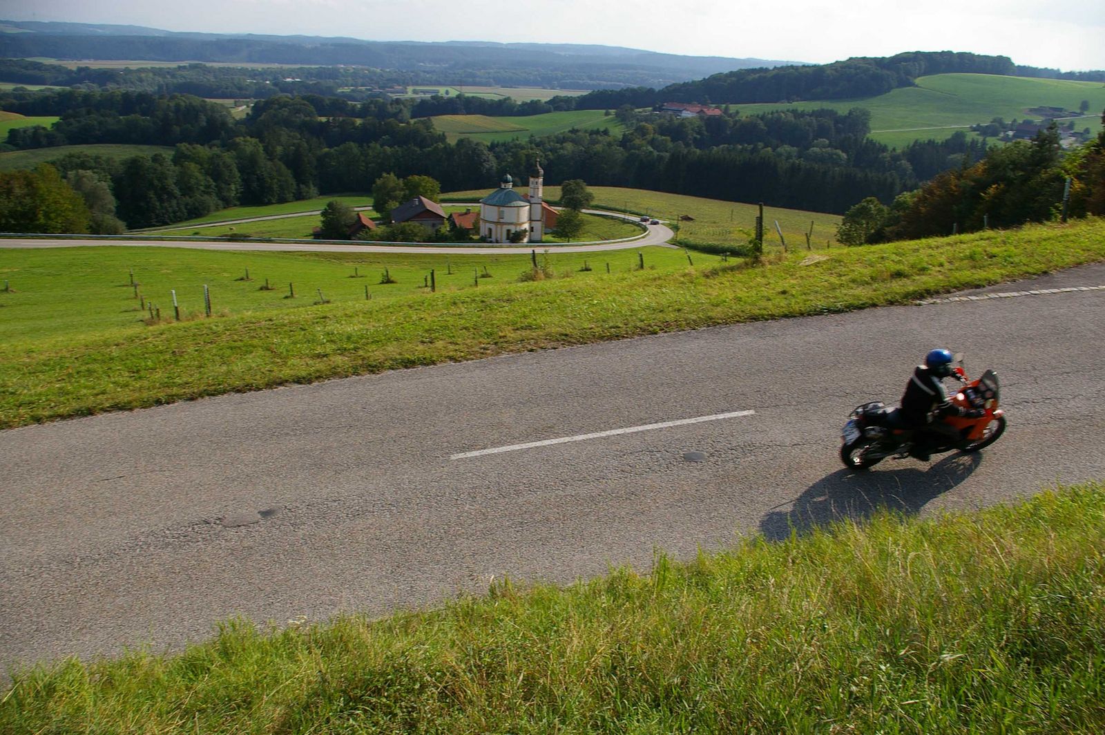 Immer wieder tauchen in den sanften Hügeln Kirchtürme auf. Oft sind nur die Spitzen zu sehen. Überhaupt gibt es sehr viel zu sehen, oft bemerke ich wie unaufmerksam ich doch bin. Zu sehr lenkt mich die Landschaft ab. Dabei sollte man trotz des wenigen Verkehrs schon konzentriert bei der Sache sein. Der Straßenbelag wechselt häufig und oft ohne Vorwarnung gerne auch mal Wald, wo die Augen dem schnellen hell dunklen Kontrast nicht hinterherkommen. Manche Kurve kommt unerwartet oder nimmt einen anderen Verlauf als man sich das dachte oder wünschte. Also, entweder mehr auf die Straße konzentrieren und weniger „spatzierenschauen“ oder langsamer fahren. Beides fällt uns nicht leicht. Zu groß ist die Verlockung wenn sich der Asphalt in übersichtlichen Schwüngen Richtung Horizont zieht.
