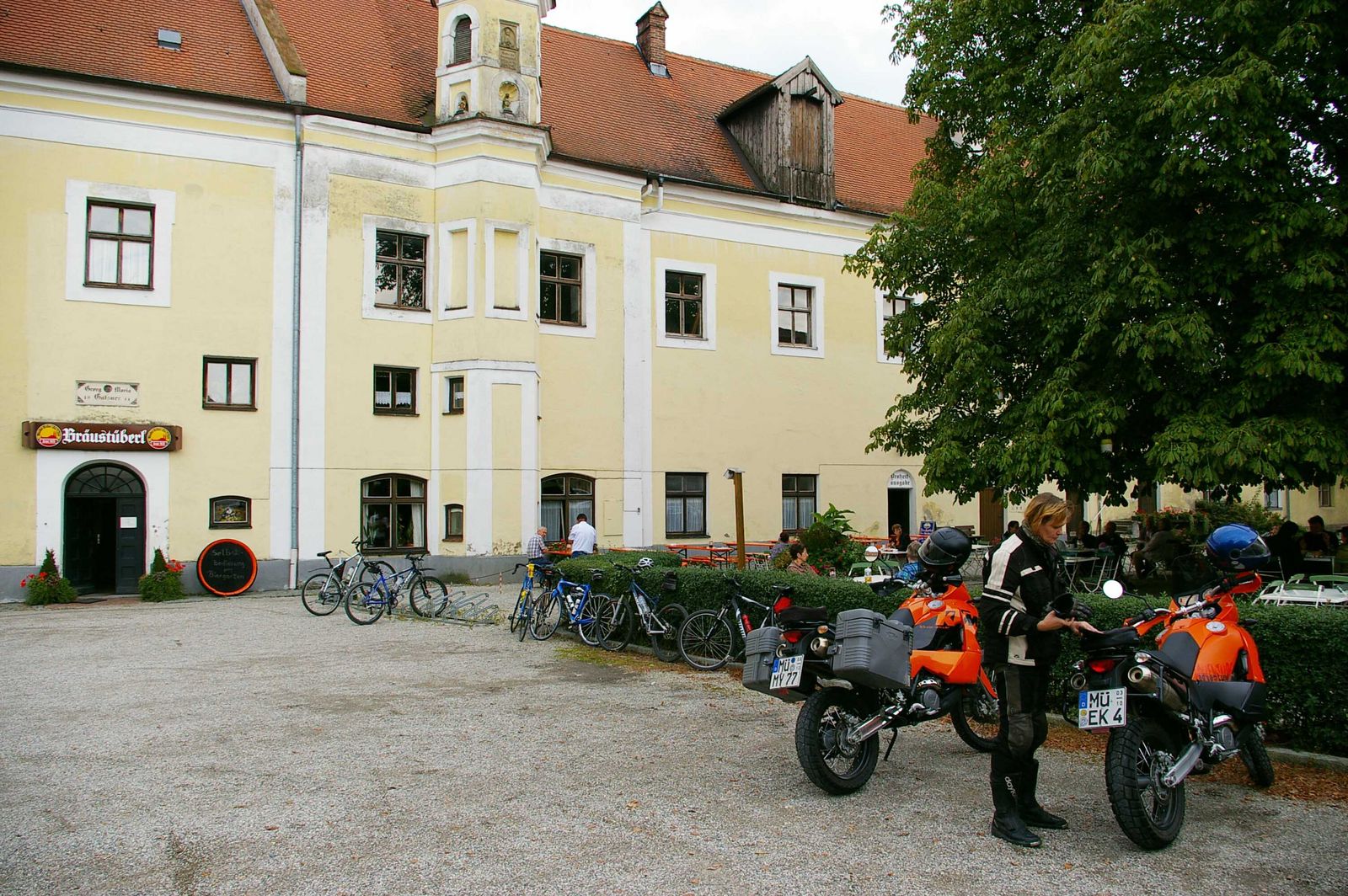 Es gibt nicht viele Gelegenheiten an denen ich den Sattel der KTM mit einem Beifahrersitz in einem Auto tauschen möchte. Aber jedes mal wenn wir hier im Klostergarten sitzen kommt der Wunsch auf. Um uns herum trinken alle das köstliche Kloster Au dunkel und wir…. Apfelschorle. Ein Glück wer jetzt Koffer am Motorrad hat, so kann er jetzt wenigstens ein paar Flaschen für später mit nach hause nehmen.