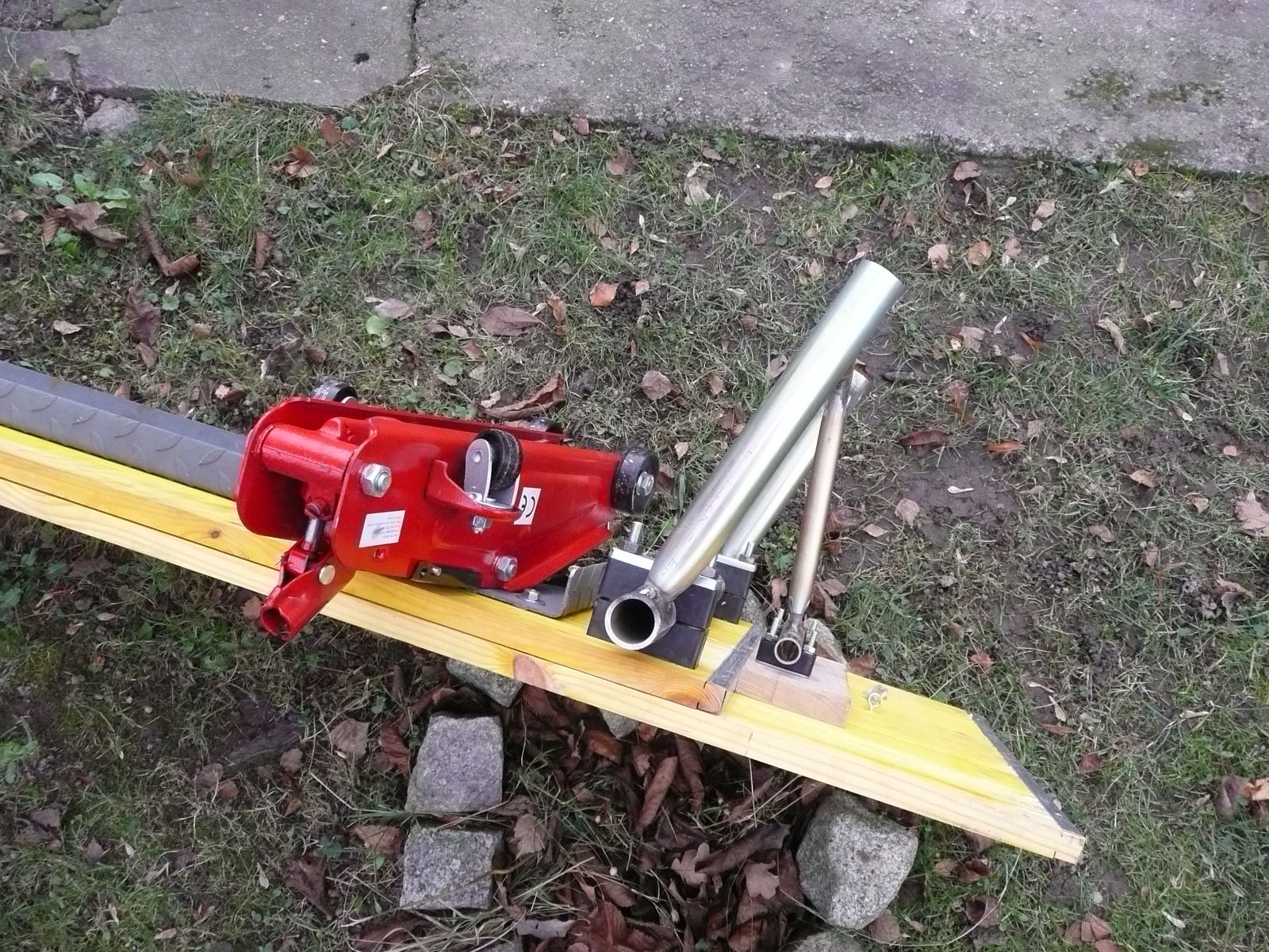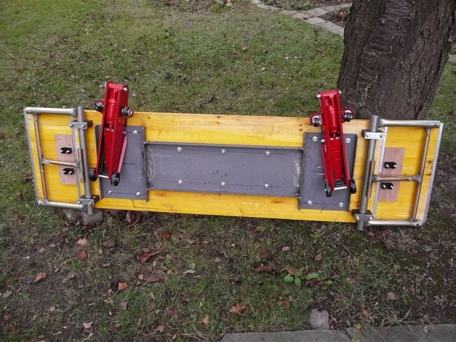 Die Grundfläche beträgt jetzt 500x2000mm, im Bereich der Doppelung (1500x500mm) ist die Platte 40mm dick. Die niedrigste Höhe ( zum Auffahren der Maschine) ist ca. 150mm, die Höhe auf dem eingerasteten Grundständer liegt derzeit bei ca. 320mm (Oberkante Platte). Durch stufenweises anheben und unterbauen der Wagenheber und Ständer mit Hilfskonstruktionen (z.B. stabile Quader/Kästen aus Multiplexplatten) lässt sich die Montagehöhe bis fast ins Unendliche steigern (man denke an diverse Pyramiden- oder Tempelbautechniken).