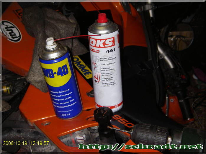bei meinem Federbein war das Handrad der Federbasisverstellung schwergängig. Habe es mit Silikonöl schmieren wollen, daraufhin ging es noch schwerer. Danach habe ich Kriechöl und Haftschmiermittel probiert, daraufhin klemmte es völlig. Mit Bremsenreiniger bewegte es sich dann wieder eine halbe Umdrehung, aber nun geht gar nichts mehr.
