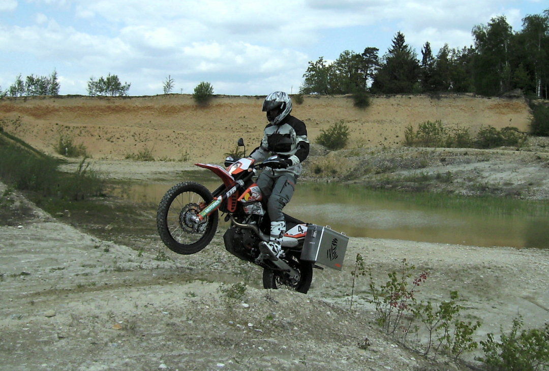Das Fahrwerk ist für eine Enduro unglaublich straff abgestimmt. Nicht nur auf Kopfsteinpflaster hoppelt das Moped, wie ein unwilliges Muli beim Gepäck aufladen. Die Gabel taucht beim Bremsen selbst in der Komforteinstellung kaum ein. Der Scheffy hat meine 690er mal kurz Probe gefahren. Darauf angesprochen, meinte er: "Das Moped ist wirklich schön leicht und handlich. Aber für's Gelände ist es nicht gemacht. Höchstens mal ein paar Schotterwege." So sehe ich das inzwischen auch. Straßen dritter Ordnung, einspurige Almwege, mecklenburger Kopfsteinpflaster, da gehört die 690er hin.