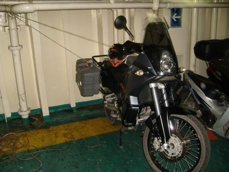 Wenn die Möglichkeit besteht, das Mopped immer mit dem Seitenständer zur Schiffswand stellen. Zwischen Koffer und Wand den Rückenprotektor einklemmen, oder ersatzweise ein festes Stück Pappe etc. SEILE SELBER MITNEHMEN....iss nicht gesagt das in der Garage welche zu finden sind. SELBER DAFÜR SORGEN DAS MOPPED GUT VERZURRT IST.....NICHT AUF DAS PERSONAL VERLASSEN!!!!!!! UND WENN: daneben stehen bleiben und zusehen. Die binden die Seile an Seilzüge und sonst wohin (oft!), die übelsten Sachen schon gesehen, wobei das Personal noch um einiges besser ist von ITA nach GR als innergriechisch...da isses ne Katastrophe.