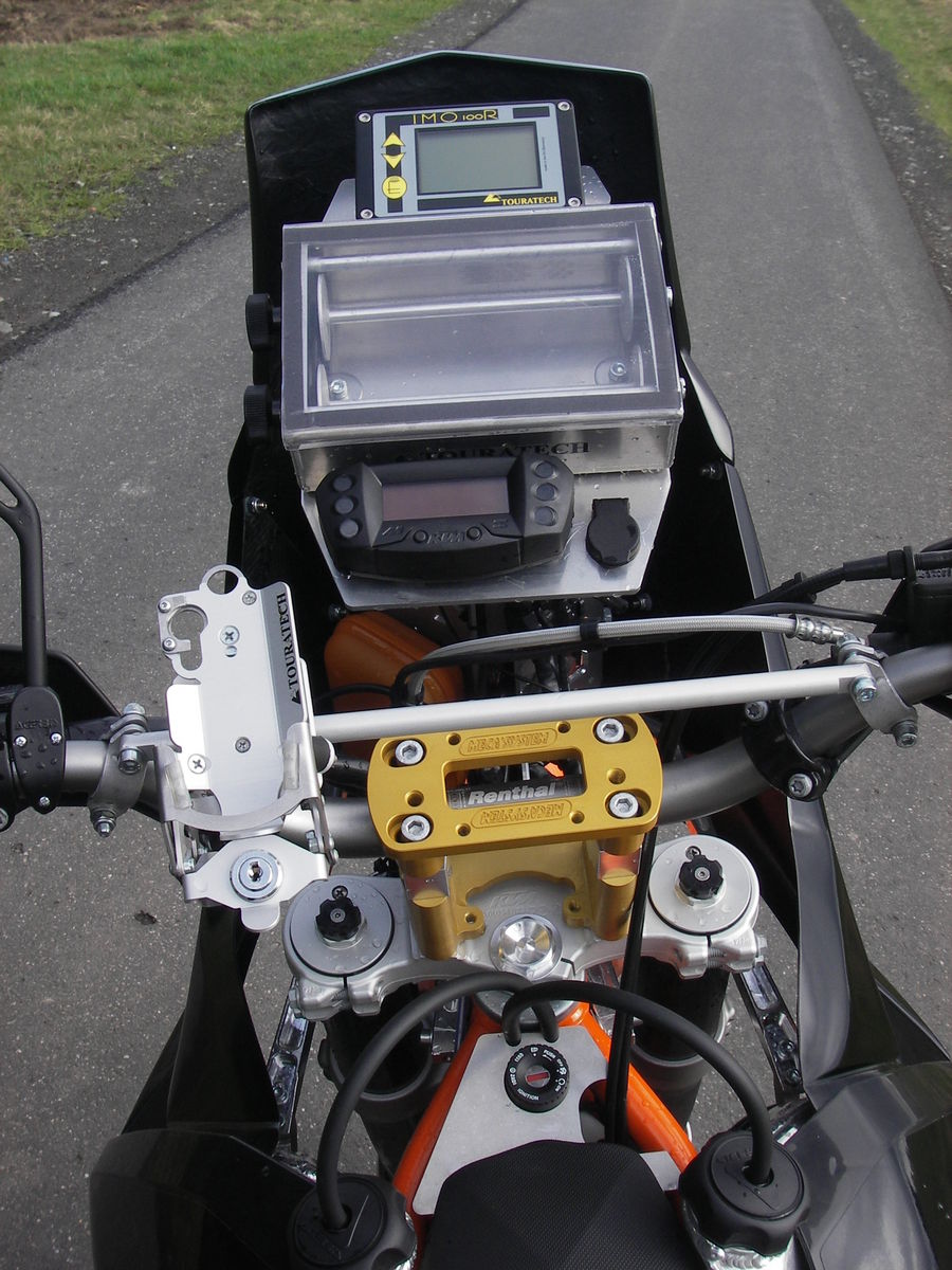 Da es sich um ein aus dem vollenem gefrästem Stück handelt und damit wirklich richtig stabil ist, habe ich noch eine 3 cm Erhöhung von Touratech oder KTM (weiss nicht mehr genau von wem, da ich die schon etliche Jahre habe) dazwischen gepackt. Mit den 3 cm tieferen Fussrasten von Motobau kann auch ich mit 1,96 cm echt super im Gelände stehen.
