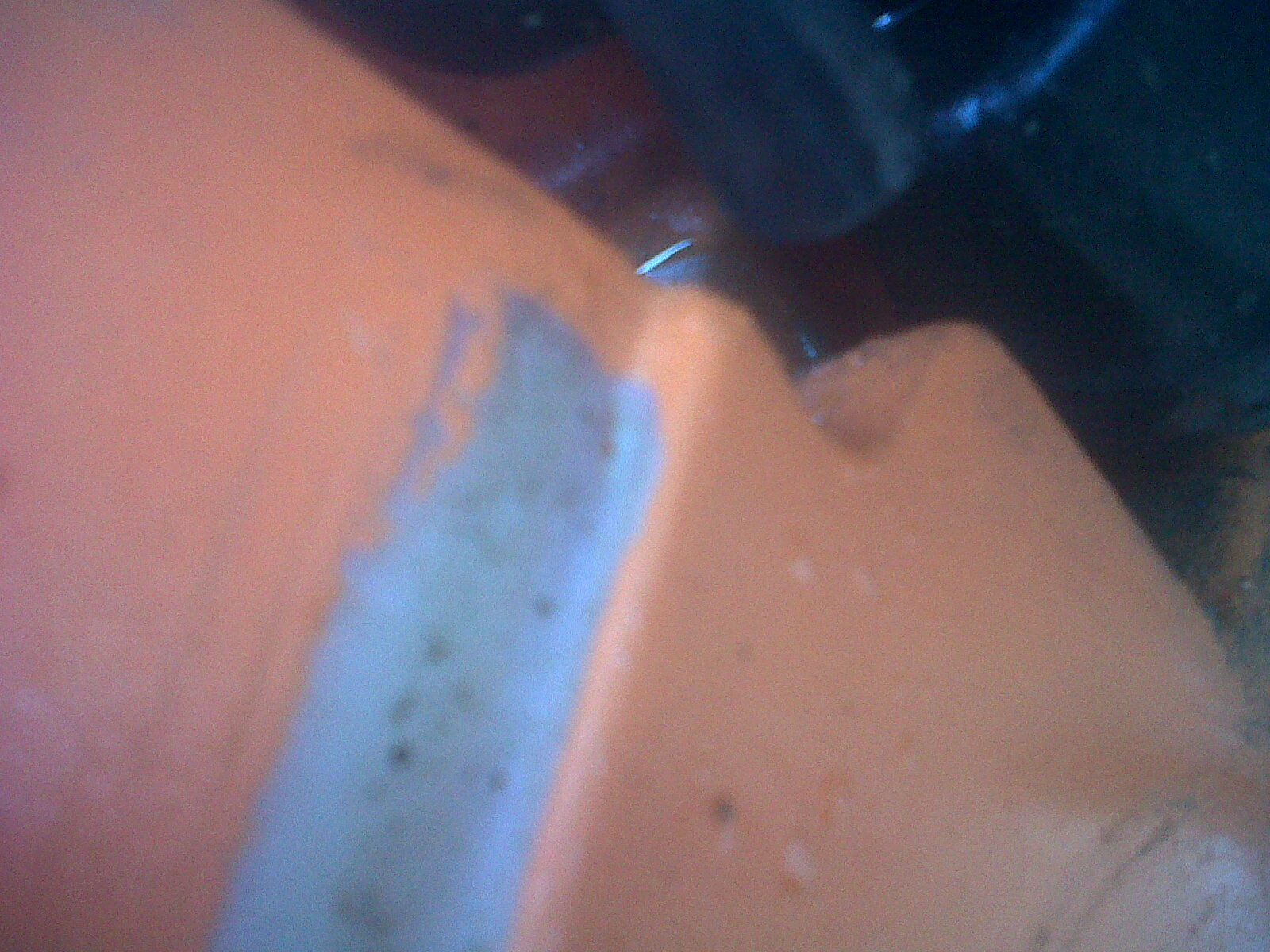 Hier tratt ganz langsam Benzin aus der rechten Tankhälfte in Höhe der oben aufgeschraubten Verkleidung aus. Nach der Demontage der Verkleidung konnte ich ein stecknadelgroßes Loch auf der Innenseite der Tankhälfte im Bereich der innenliegenden schwarzen Kunststoffblende des oberen Verkleidungsteiles feststellen. Hier hat sich im laufe der Jahre durch die Vibrationen auf dem ca. 5 cm langen Auflageteil des Tankes wo die Seitenverkleidung aufliegt, die schöne orange Farbe weggescheuert und anschließend schön langsam das Tankwandmaterial durchgescheuert.