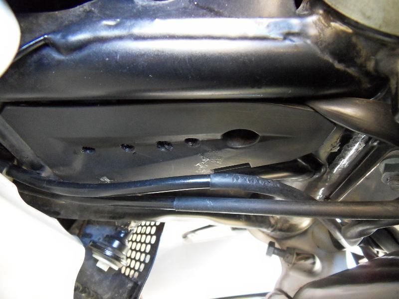 Habe jeweils 4 Löcher (6mm) in die 2 Plastik-Abdeckungen am Rahmendreieck gebohrt (wollte die Abdeckungen nicht ganz weglassen, da ich oft sehr staubig unterwegs bin). Auf der Innenseite der Abdeckungen, über die Bohrungen habe ich feinmaschiges Eisengeflecht angepaßt und mit Sekundenkleber fixiert (damit keine kleineren Teile Richtung Lufi durchgezogen werden).