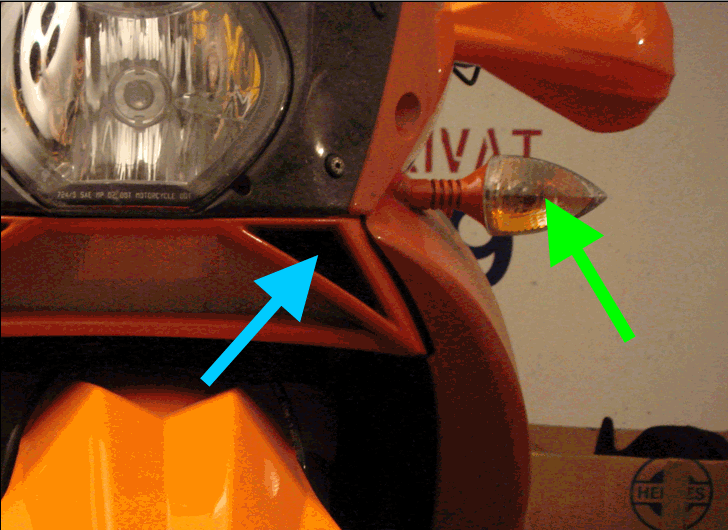 Die Idee war, den vorderen Blinker an der Serieneinbauposition (grüner Pfeil) zu ersetzen, durch irgendeinen Zubehörblinker, der hoffentlich mehr oder weniger in die Verkleidung unter dem Scheinwerfer passt (blauer Pfeil).