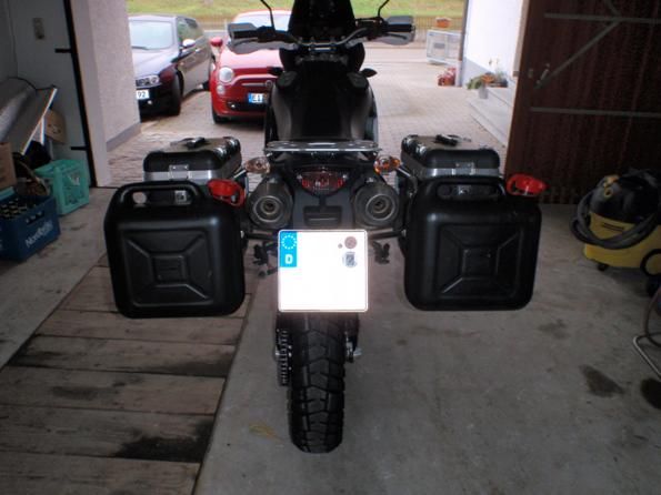 Fahre ich solo, sind die Tanks vorne, im Soziusbetrieb werden einfach die Koffer ausgetauscht und die Kanister sind hinten, ich hoffe dass hier die Abgase nicht zu heiß sind, was meint Ihr?