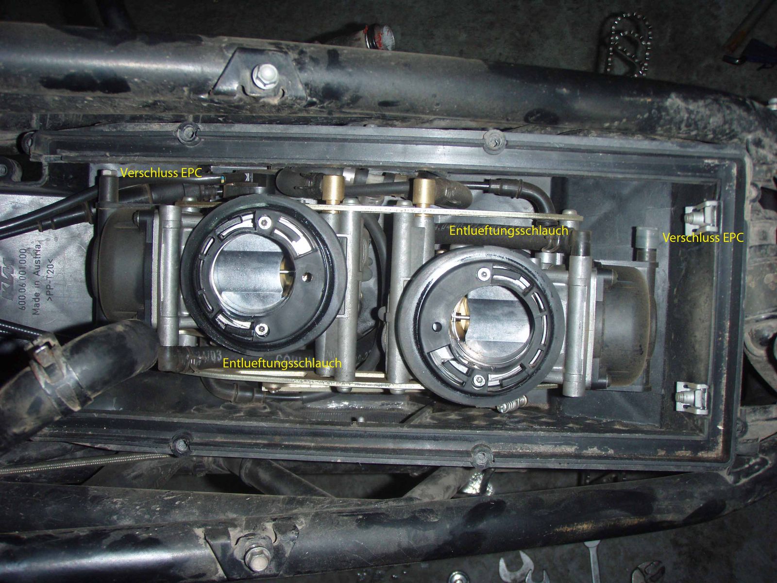 die beiden Entlueftungsschlaeuche gehen nach unten aus dem Lufikasten raus und duerfen nicht geknickt sein. Die EPC Schlaeuche fest drauf, bzw die Stopfen wenn kein EPC?