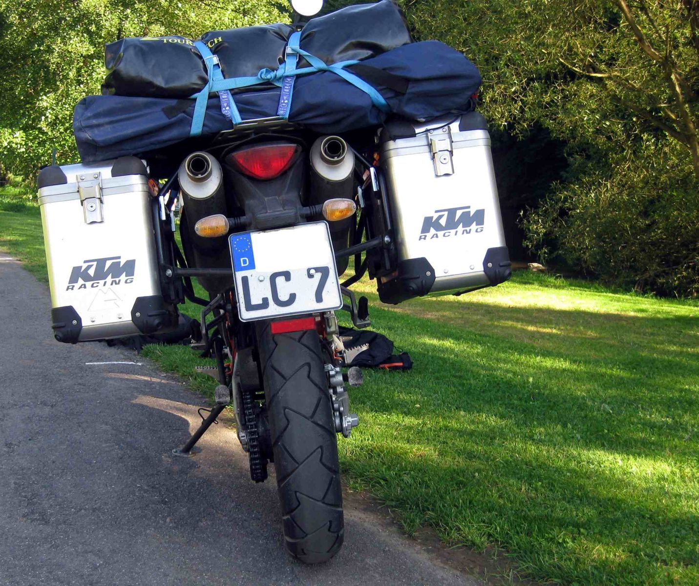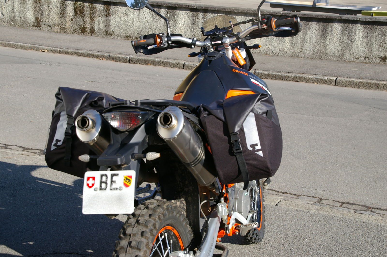 Die KTM Taschen sind kleiner als die Monson und können ebenso über eine breite Lasche (schnell) über den Sattel geworfen (Cowboy ) werden (oder besser unter dem Sattel durchgeführt werden). Unten machst man dann ebenso je 2 Laschen fest. Hält aber schlecht und rutscht hin und her, je fester Du die Taschen unten anziehst, desto näher drückt es die Verkleidung an die Enttöpfe. Bei Hitze und/oder langsamer Fahrt problematisch. Schau mal auf mein Bild - ich habe die Taschen innen mit Feuer/Flammschutz von einem Feuerwehr Poncho verkleidet, half aber auch nicht wirklich (siehe oben). Zu guter letzt habe ich dann halt die dünnen, sauteuren Träger dazu gekauft. Jetzt passt es.