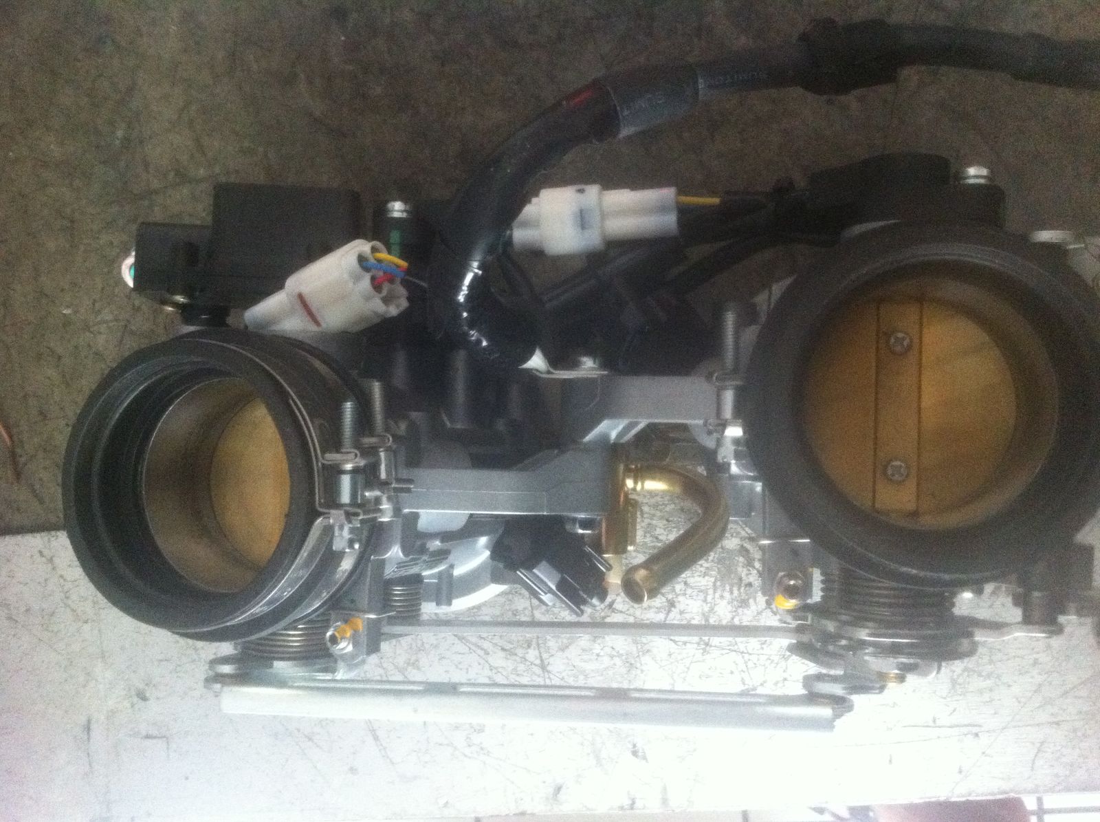 Auf meine Frage bei bekannter KTM Werkstätte bekam ich die Antwort, dass bei einem Unterschied des Drucks von zB 0,05 bar der Sensor das erfasst, und über die oberen Klappen in der Einspritzanlage und deren Stellmotor diesen Unterschied ausgleicht. Aber hier sind wir schon beim Problem. Es ist nur ein Stellmotor, der beide Klappen betätigt. Diese sind über eine starre Verbindung miteinander verbunden. D.h. wenn der Sensor sagt "auf vorderen Zylinder weniger Unterdruck" dann öffnet die obere Klappe des vorderen Zylinders ein Stück, um den Unterdruck zu verringern. Gleichzeitig müsste aber, um den Unterschied ja auszugleichen, die obere Klappe des hinteren Zylinders ein wenig schließen um den Unterdruck zu erhöhen. Da diese beiden aber starr verbunden sind, würde in diesem Beispiel noch weniger Unterdruck im hinteren Ansaugtrakt herrschen, als vor dem "regulieren".