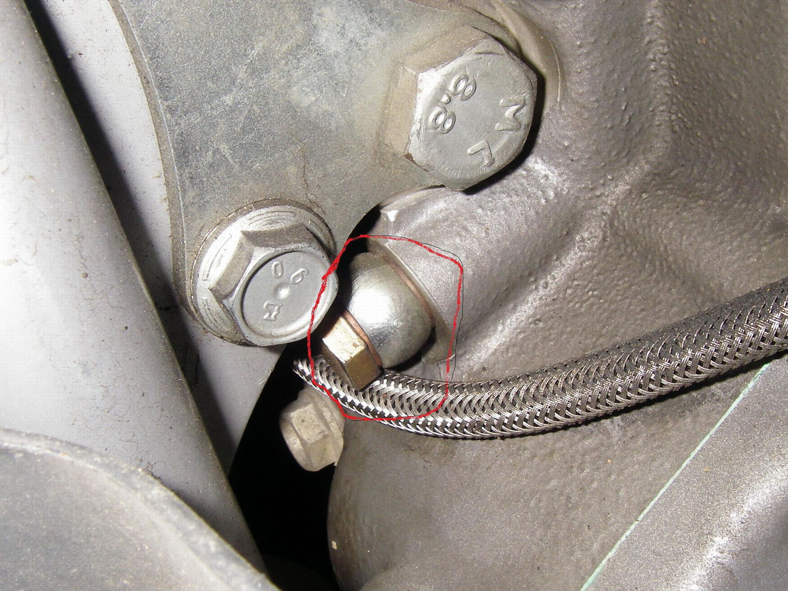 Rechte Motorseite Stahlflexleitung nach vorne. Fehlt vor 2005.