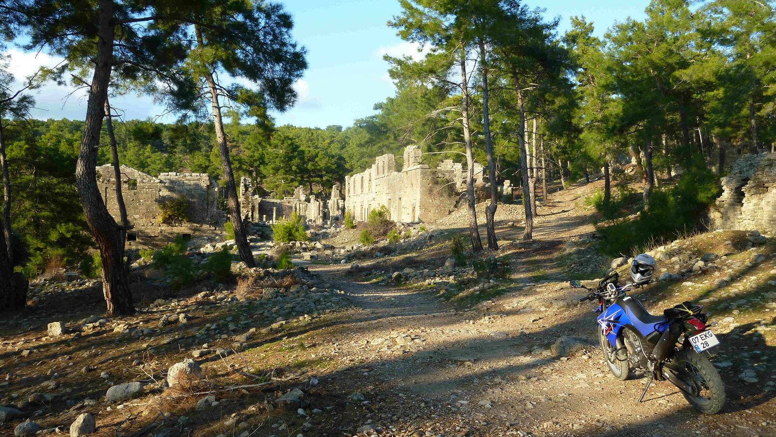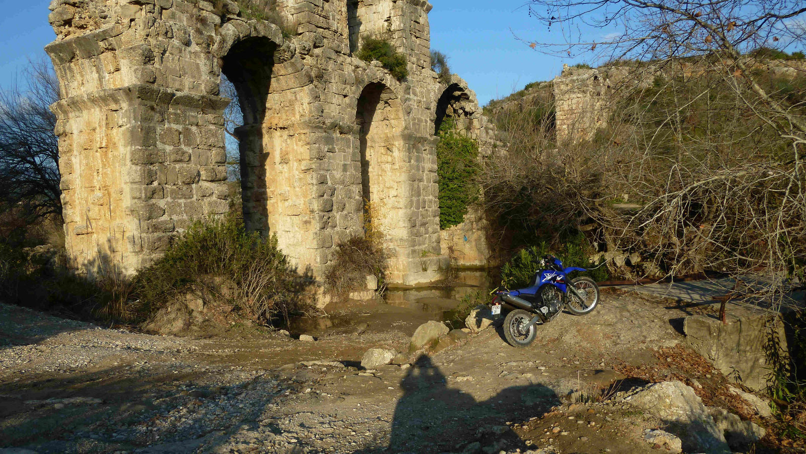 Erste Runde in Tourenbekleidung, Side zu den Manavgat-Stromschnellen, nix besonderes, dann das antike Lybre, paar schöne Aquedukte und dann die Anlage auf 300 m Höhe. Sides Umgebung ist außerhalb nicht sehr einladend, lediglich die umfangreichen Ruinen in Strandnähe wirken sympathisch. Im allgemeinen liegt ziemlich viel Müll in der Landschaft rum. Je weiter man in Berge kommt, desto schöner wird’s. Alles in allem angenehme 75 km gefahren. In den Bergen sind die Wege schon ganz schön grob, Morgen werden Enduroklamotten angezogen.