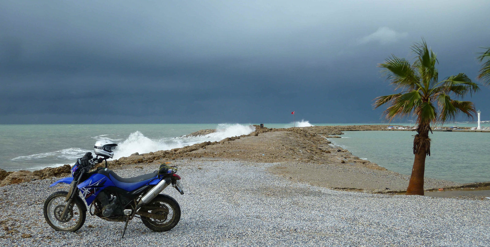 Mit leichter Verspätung kam die Yamsel an, alles gut, der montierte Metzeler ENDURANCE hat noch bestenfalls 40 %, das is nich so dolle, nun, geht noch, weil’s trocken ist. Kurze Proberunde zum Strand, darauf gabs einen leckeren frisch gepressten Granatapfel-Saft. Das Motorrad hat guten Druck, klingt vernünftig und die Sitzposition passt, meinen TT-Halter samt Oregon mit Openmtbmap-Türkeikarte problemlos montiert. Im Gegensatz zu der BMW F 650 GS-Gießkanne die ich mal auf Madeira hatte.
