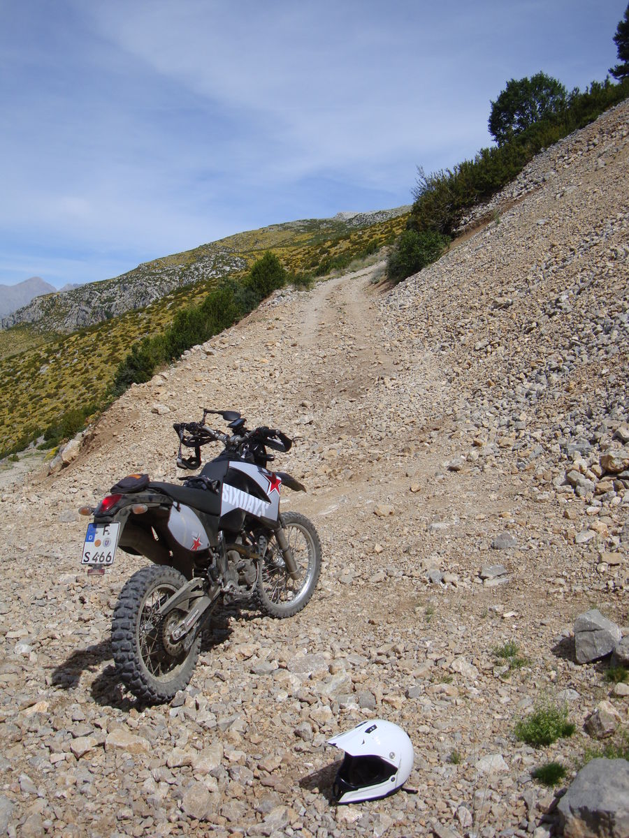 Beide sind wir recht früh mal hingesegelt was Ostmarkus einen dicken Fuß und mir eine ordentlich geprellte Hüfte eingebracht hat. Aber nach einem Tag Pause gings mit etwas mehr Respekt vor dem Gekiesel dort wieder recht gut weiter. Der Rest war Kleinkram: Bei mir ein undichter Limadeckel -erst Schauglas undicht, dann nach dem kleben die Dichtung vom Deckel hinüber- und beim Ostmarkus war ab und an mal die Tankentlüftung ...oder was auch immer dicht gegangen. Achja, eine Speiche hat's ihm aus dem Vorderrad geschlagen. Aber das erzählt er bestimmt noch selbst.