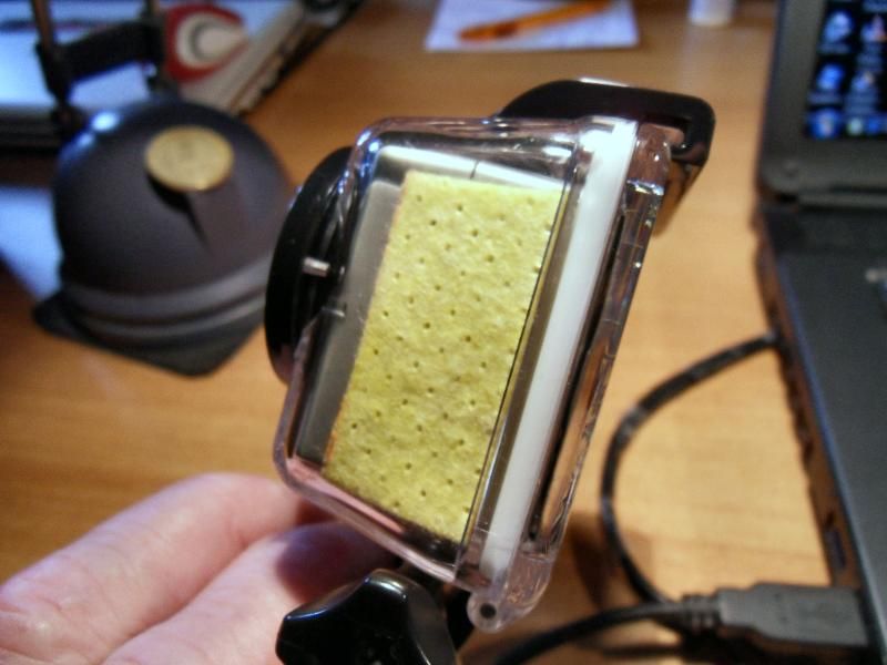 Ich machs kurz.....1000 Dinge probiert: Alu-Küchenfolie hinten auf die Kamera, ganzflächig, soll die Kondensbrühe von der Linse (kältester Punkt im Plastikgehäuse) ableiten, rechts und links der Kamera ersatzweise 2 kleine, zugeschnittenen Küchenschwammstückchen eingelegt (soll bald das werden, ist unterwegs:
