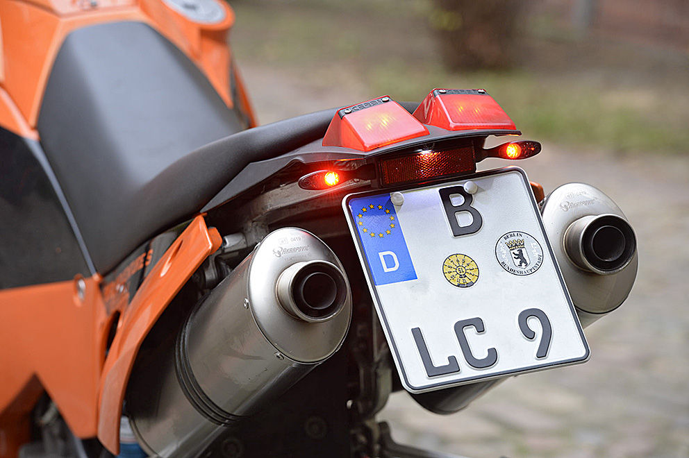 Rücklicht, Bremslicht und Blinker laufen über die Kellermänner - völlig legal mit ePrüfzeichen. Die beiden Acerbis haben das nicht, insofern wenn sie pingelig sind,... Aber genau deshalb kann ich's sofort vor Ort ausschalten. Und sie sind nur Bremslicht.